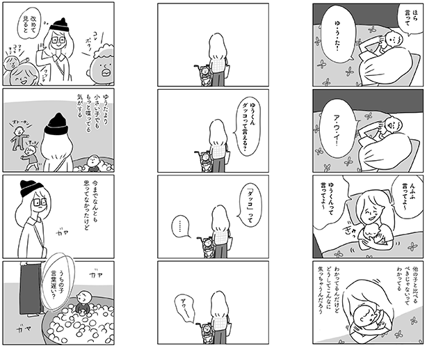 子育て世代が多く住むベッドタウン「あさひが丘」。第一子出産を機にこの街に引っ越してきたみさと一家。新築戸建て、車つき。育休が終われば職場復帰の準備も万端……今まで通り順風満帆な生活を送ると思っていた。ある日、みさとが2歳になる息子を連れて子ども広場に行き、初めてほかの親子連れに目を向けると、そこには流暢に言葉を話す同じ年の子どもたちが。うちの子は、まだ一言も喋られないのに。もしかして…うちの子、言葉が遅いの?