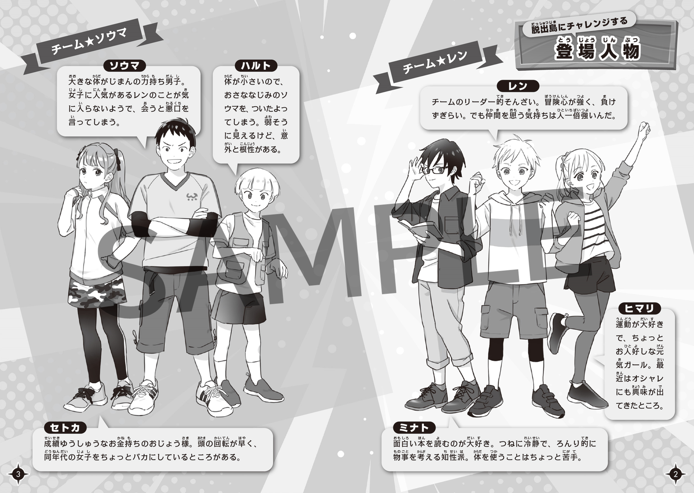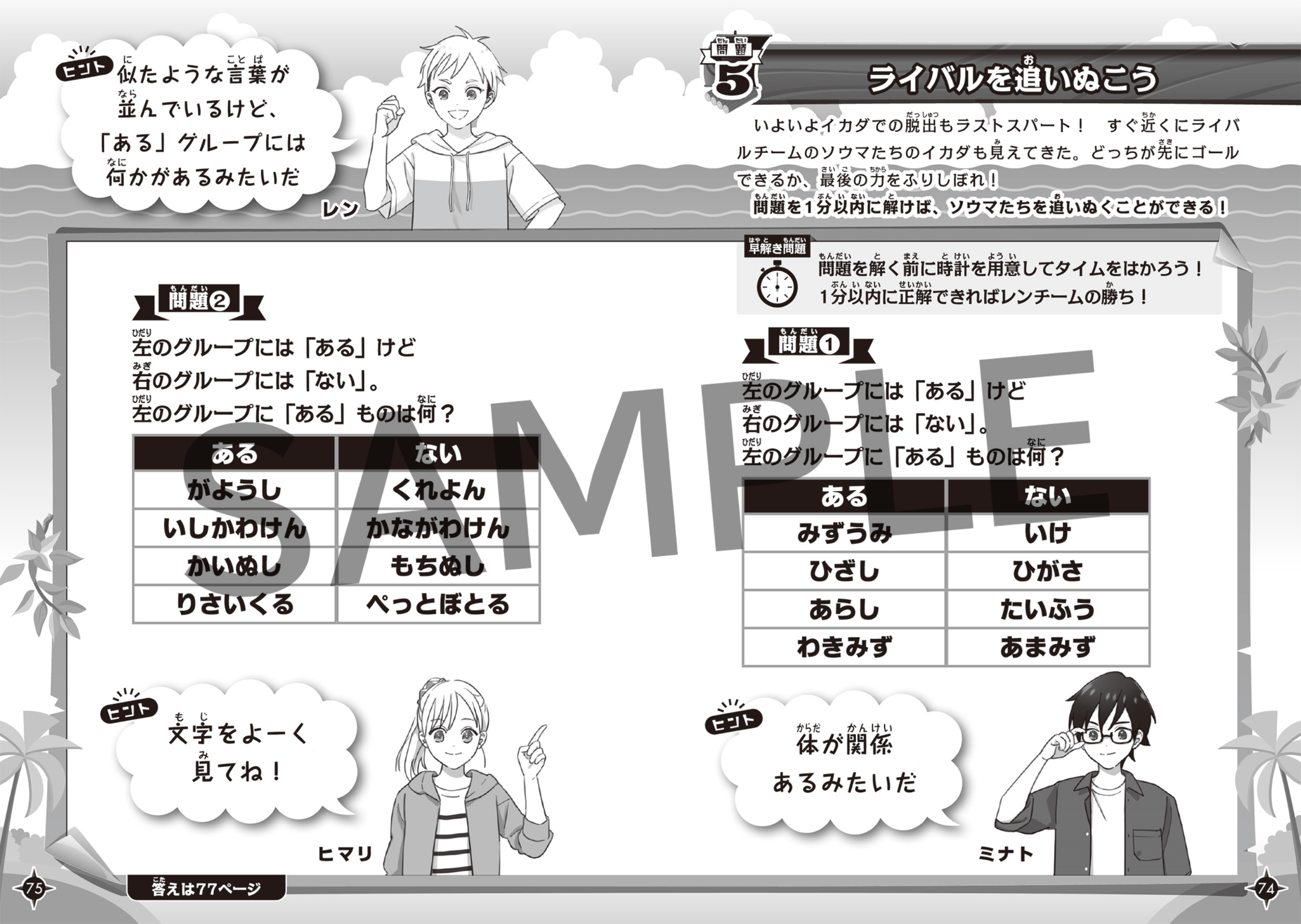 クイズ、なぞなぞ、迷路、まちがい探し、計算や漢字問題など…。ライバルと競争しながらナゾを解き、先に無人島から脱出できるのはどちらのチームなのか⁉脱出島にチャレンジするレン、ヒマリ、ミナトと、ライバルチームのソウマ、セトカ、ハルト。チーム内で力を合わせて、無人島から脱出を目指す内容となっています。