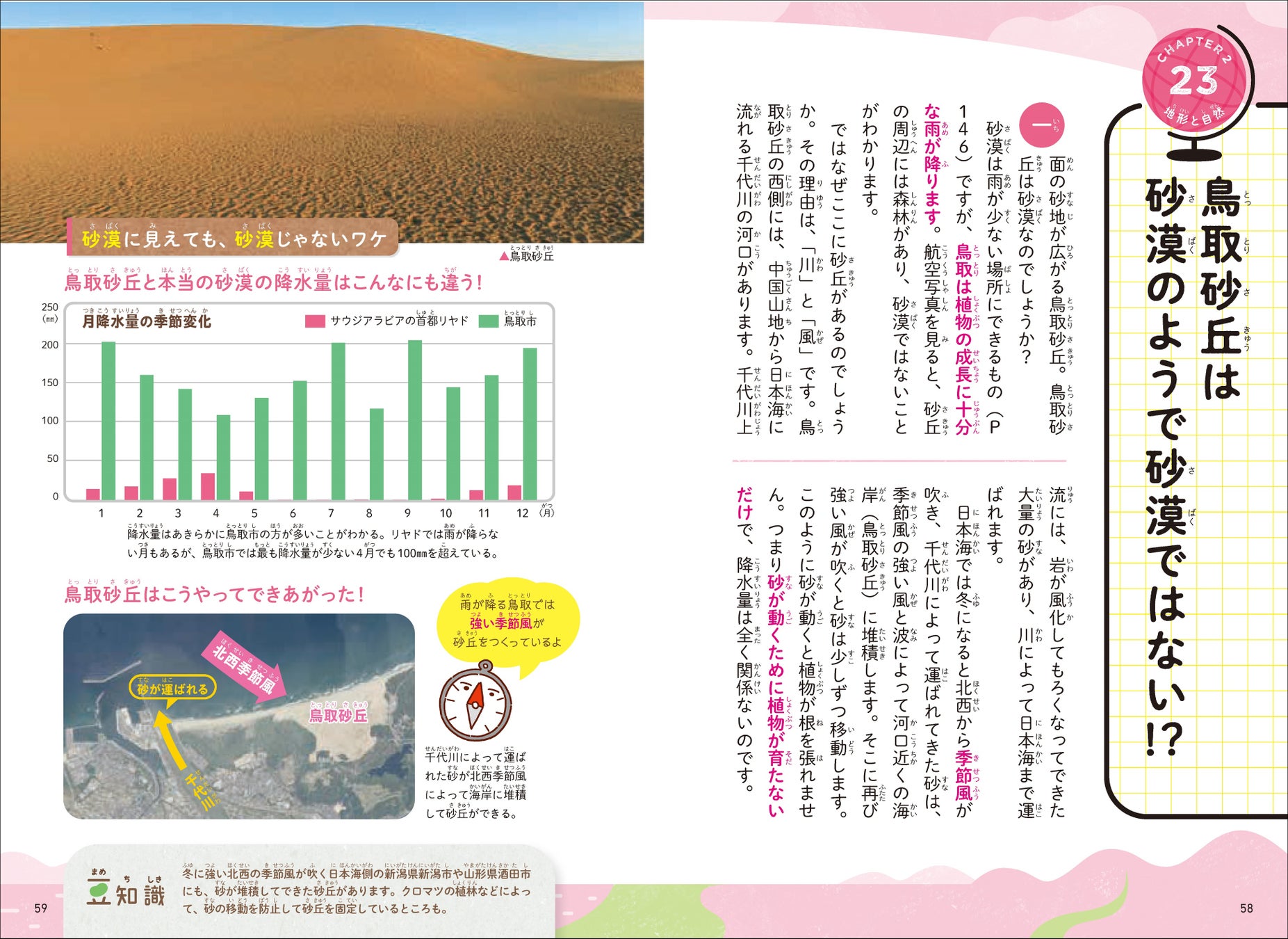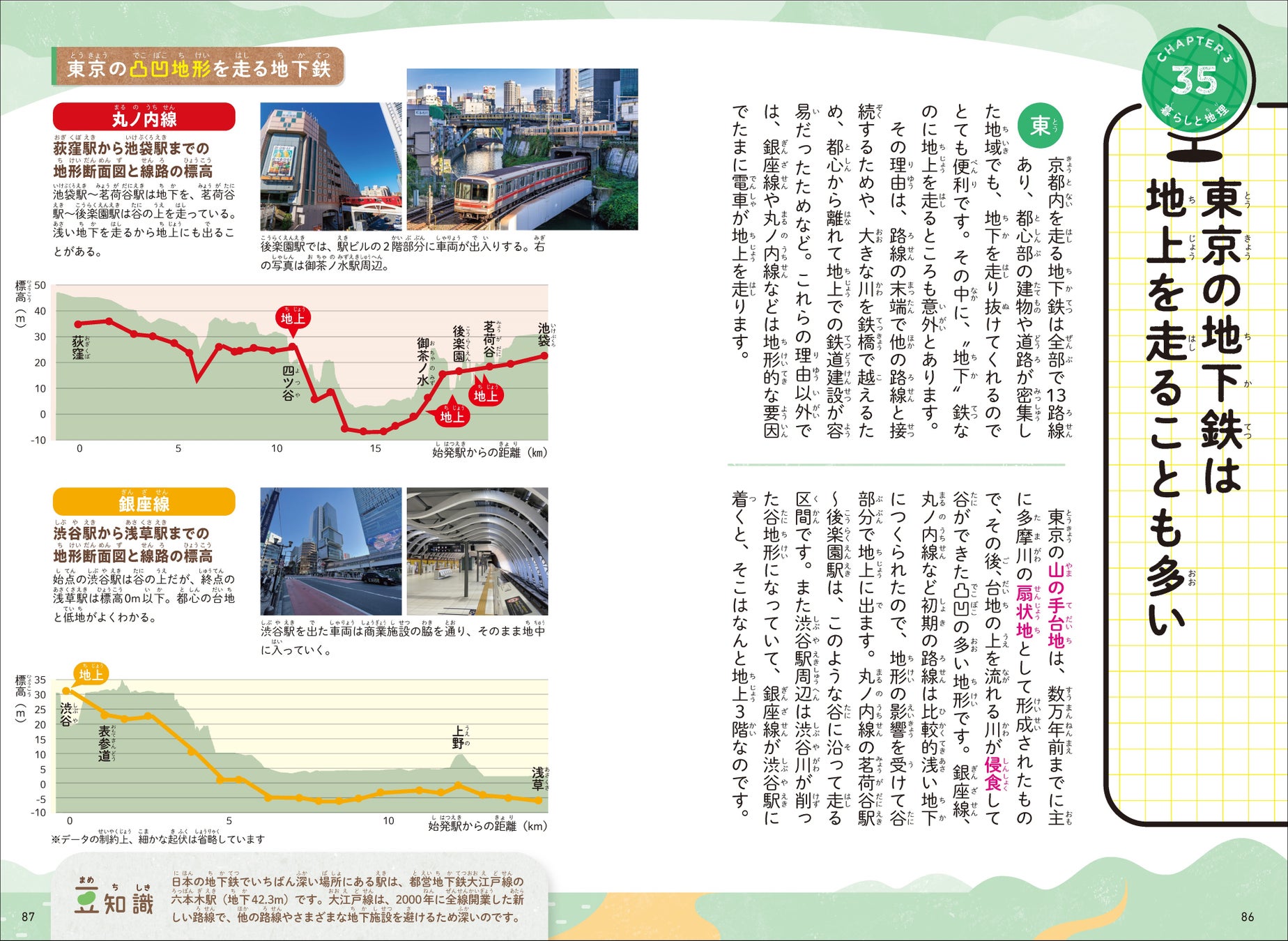 「鳥取砂丘は砂漠のように見えるけど、実は砂漠じゃない」「東京の地下鉄が地下だけではなく地上を走る地理的な理由」など、身近なトピックスから地理的な物の見方が楽しく身に着きます。地図やグラフ、図版もたっぷりで眺めているだけでも楽しい一冊です。
