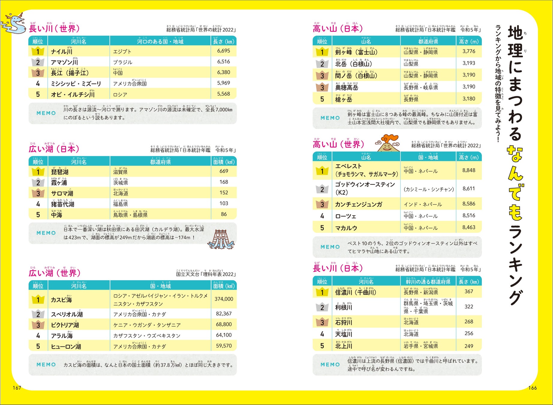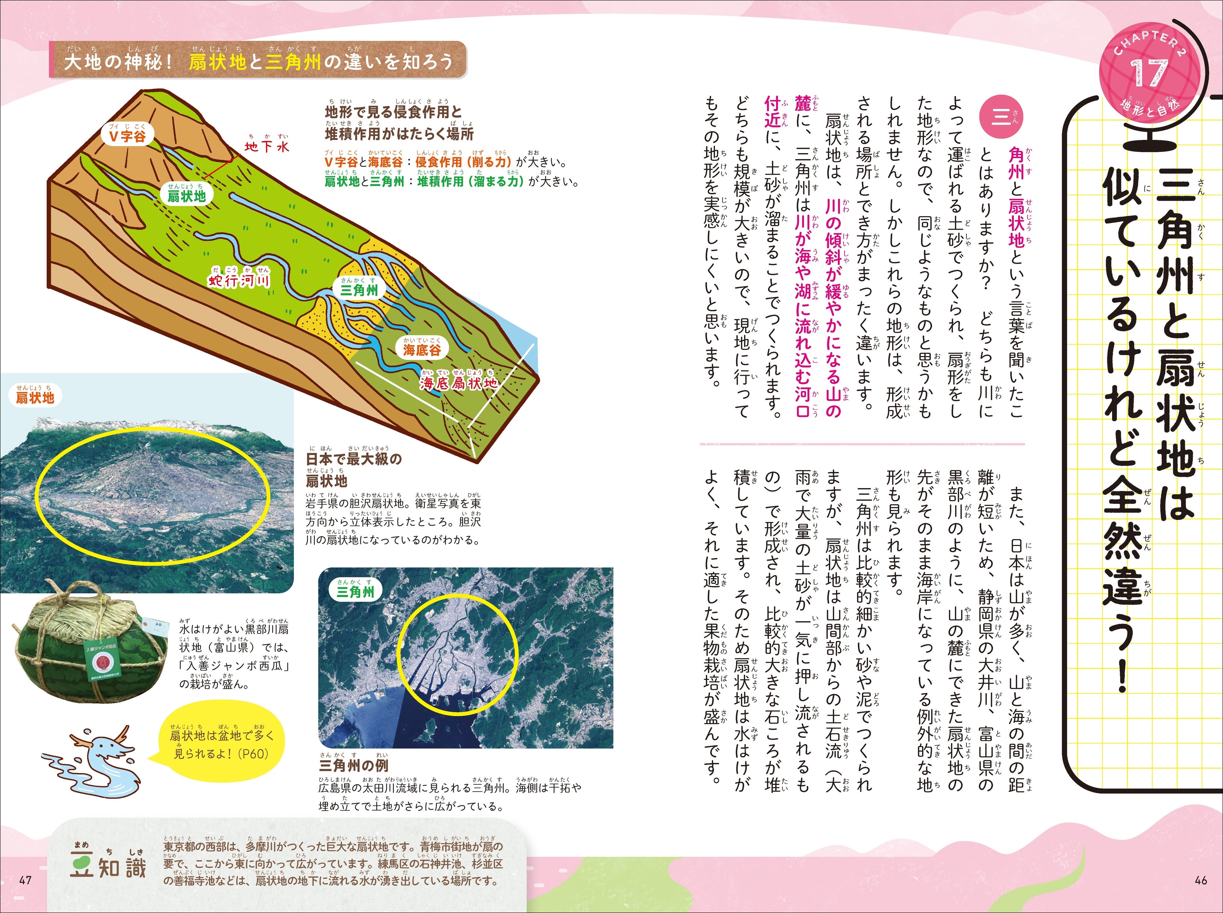 社会の授業でもおなじみの地図記号や三角州、扇状地などの情報を超くわしくご紹介。さらに巻末には世界や日本の長い川や高い山といったランキングを数多く掲載しています。勉強になるのはもちろん、思わず「へぇ~」っと言ってしまうかも。