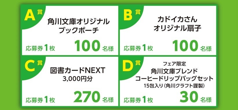 「カドブン夏推し2023」対象書籍の帯に付いている応募券を集めて応募すると、抽選で豪華賞品を合計500名様にプレゼント! 文庫の持ち歩きに便利な角川文庫オリジナルブックポーチや、暑い夏を涼しくするカドイカさんオリジナル扇子など、ここでしか手に入らないプレゼントも。読書を楽しんで、ステキなプレゼントをもらえる大チャンス。ぜひ奮ってご応募ください!