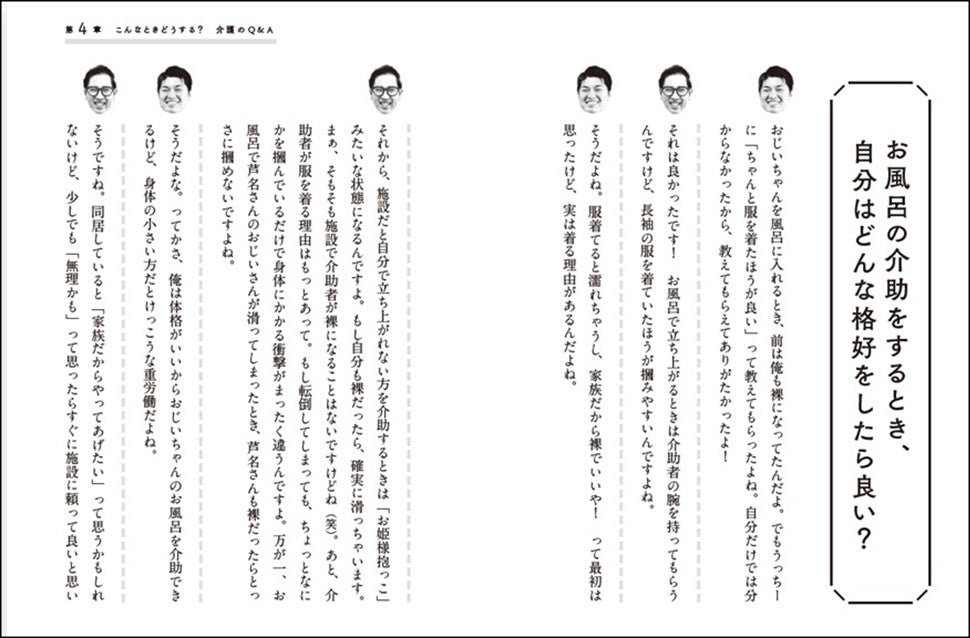 現役の介護士でもある後輩芸人・内田うっちーとのスペシャル対談も掲載。「こんなときどする?」「これ食べさせて大丈夫?」など、食事のことからお風呂ケアのことまで、介護についての素朴な疑問にプロ目線でしっかりアドバイスしています。