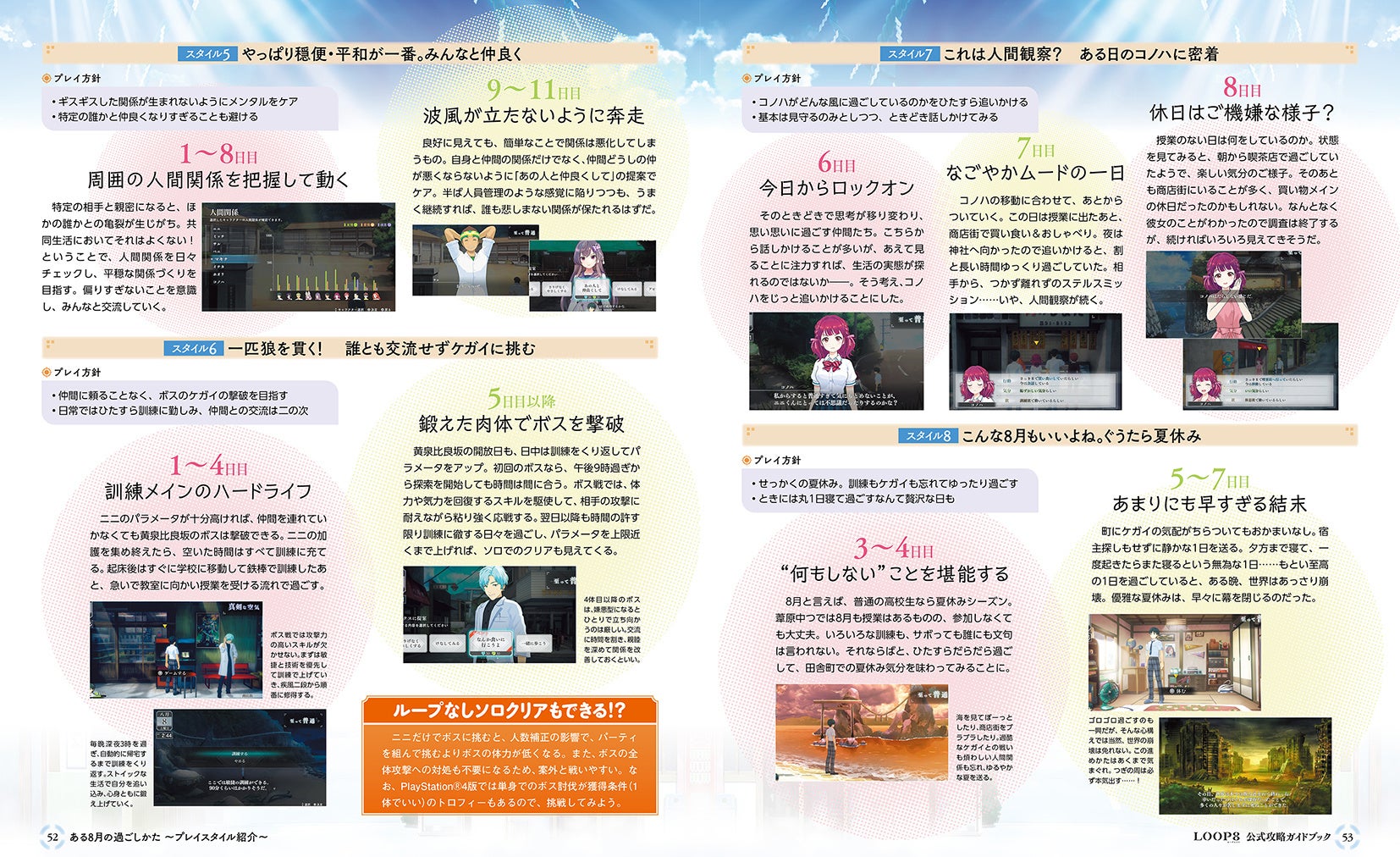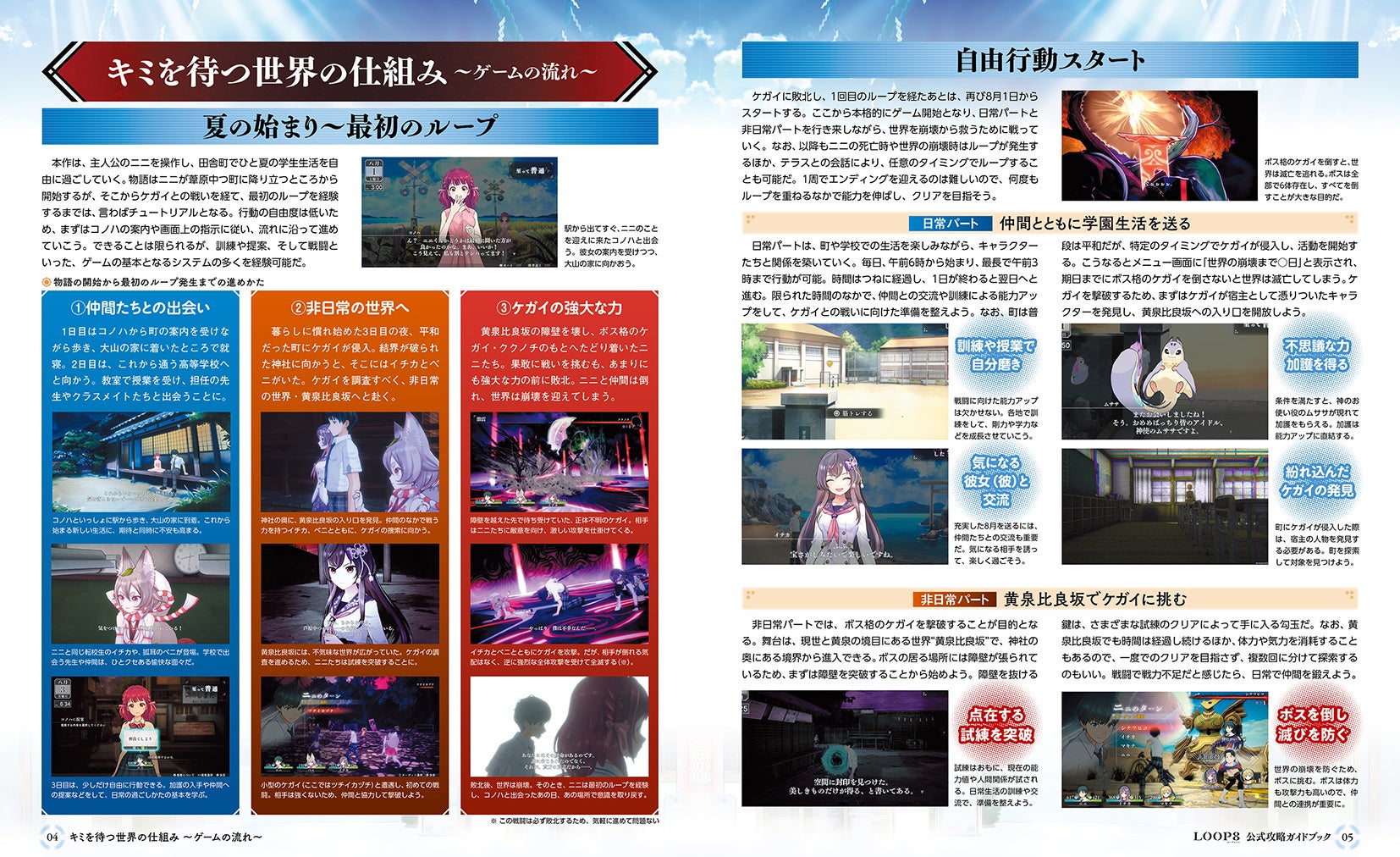 株式会社マーベラスから2023年6月1日に発売されたジュブナイルRPG『LOOP8(ループエイト)』のキャラクター紹介や進行のコツを掲載したガイドブックが、ソフトと同時リリース。謎に満ちた世界や仲間たちの詳細、人類の脅威である"ケガイ"に立ち向かう方法など、ゲームのポイントをさまざまな角度から解説しています。また、本作のゲームデザイン/シナリオを手掛けた芝村裕吏氏による書き下ろしWEB小説『A Summer Day』を1冊にまとめた小冊子と、メインビジュアルをあしらった大判のポスターも付いています。