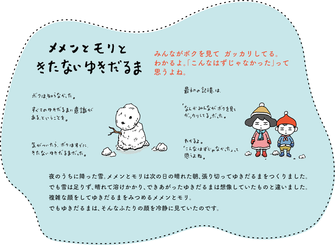 夜のうちに降った雪。メメンとモリは次の日の晴れた朝、張り切ってゆきだるまをつくりました。でも雪は足りず、晴れて溶けかかり、できあがったゆきだるまは想像していたものと違いました。複雑な顔をしてゆきだるまをみつめるメメンとモリ。でもゆきだるまには意識があり、そんなふたりの顔を冷静に見ていたのです。