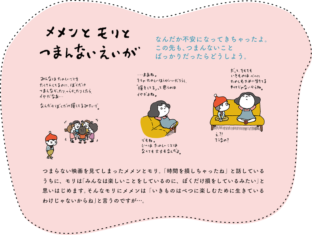 つまらない映画を見てしまったメメンとモリ。「時間を損しちゃったね」と話しているうちに、モリは「みんなは楽しいことをしているのに、ぼくだけ損をしているみたい」と思いはじめます。そんなモリにメメンは「いきものはべつに楽しむために生きているわけじゃないからね」と言うのですが...