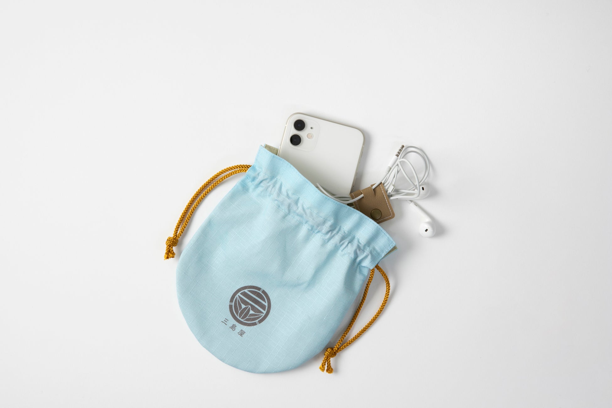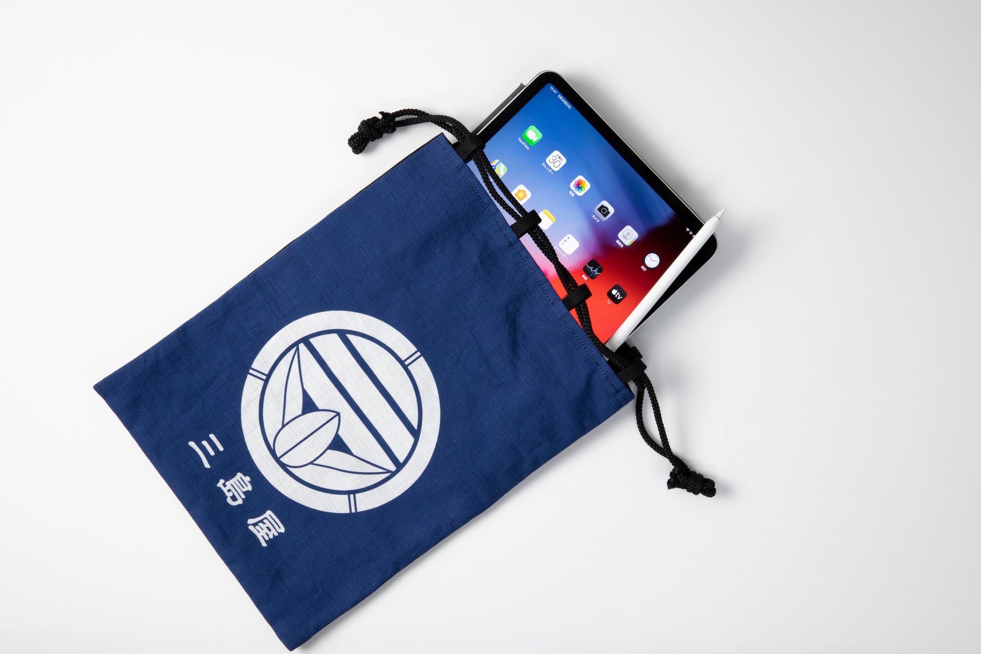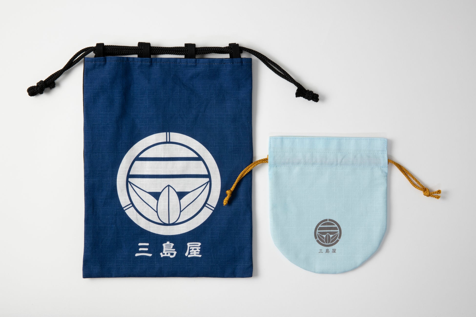 大きい方は信玄袋と呼ばれる紐通しが外に付いている形状で、長財布やタブレット、単行本などが入るサイズ。紺色のベースに白のロゴが映えるいなせで粋なデザインです。