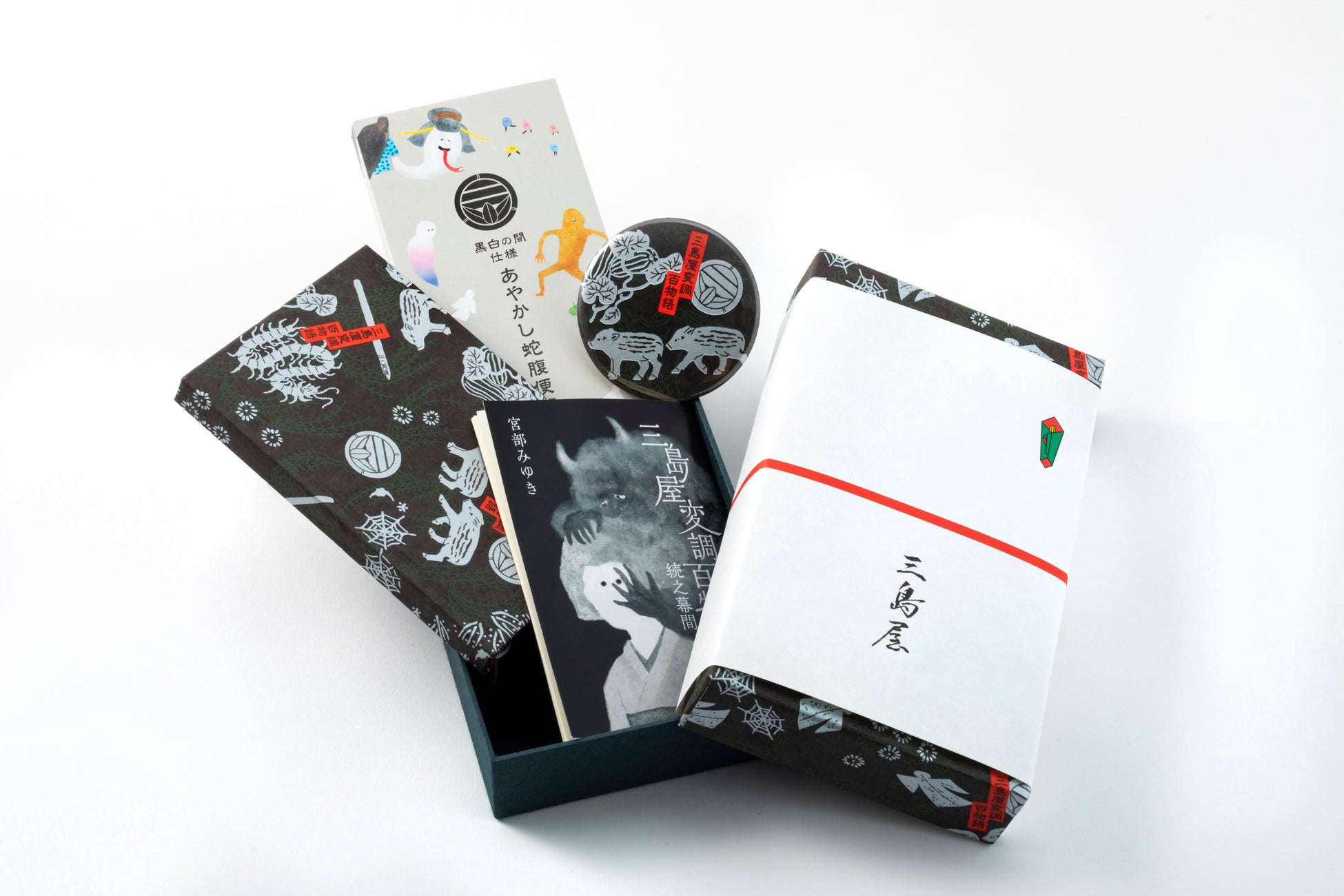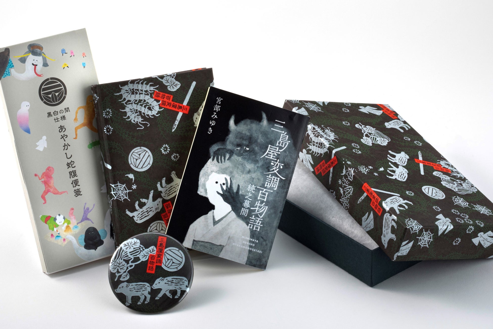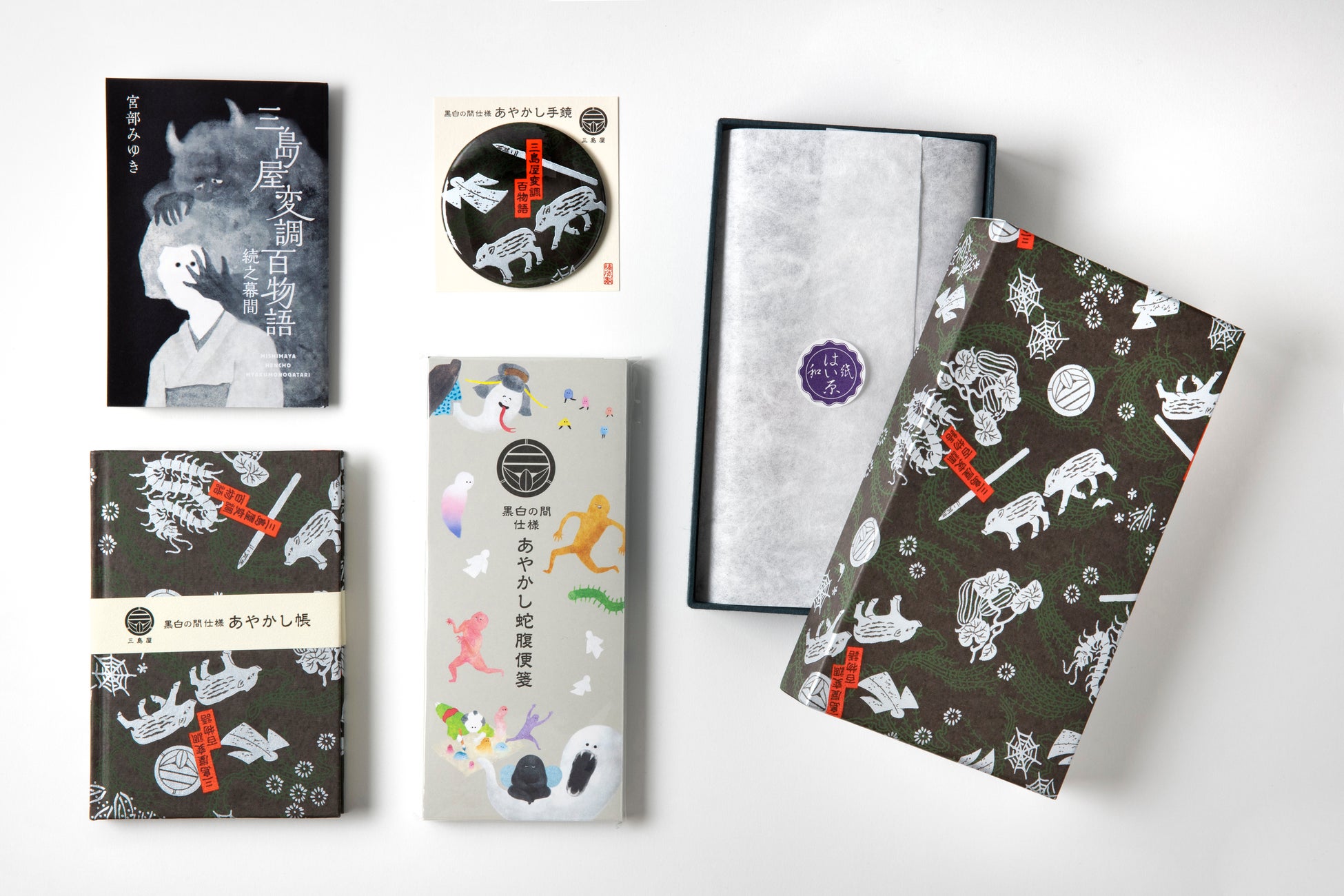 黒白の間で第二の聞き手・富次郎が「聞き捨て筺」として使っている筺をイメージした文箱〈あやかし草紙〉に、蛇腹便箋、ノート、手鏡、そして宮部みゆき氏が書き下ろした掌編の小冊子がついた、豪華5点セットです。