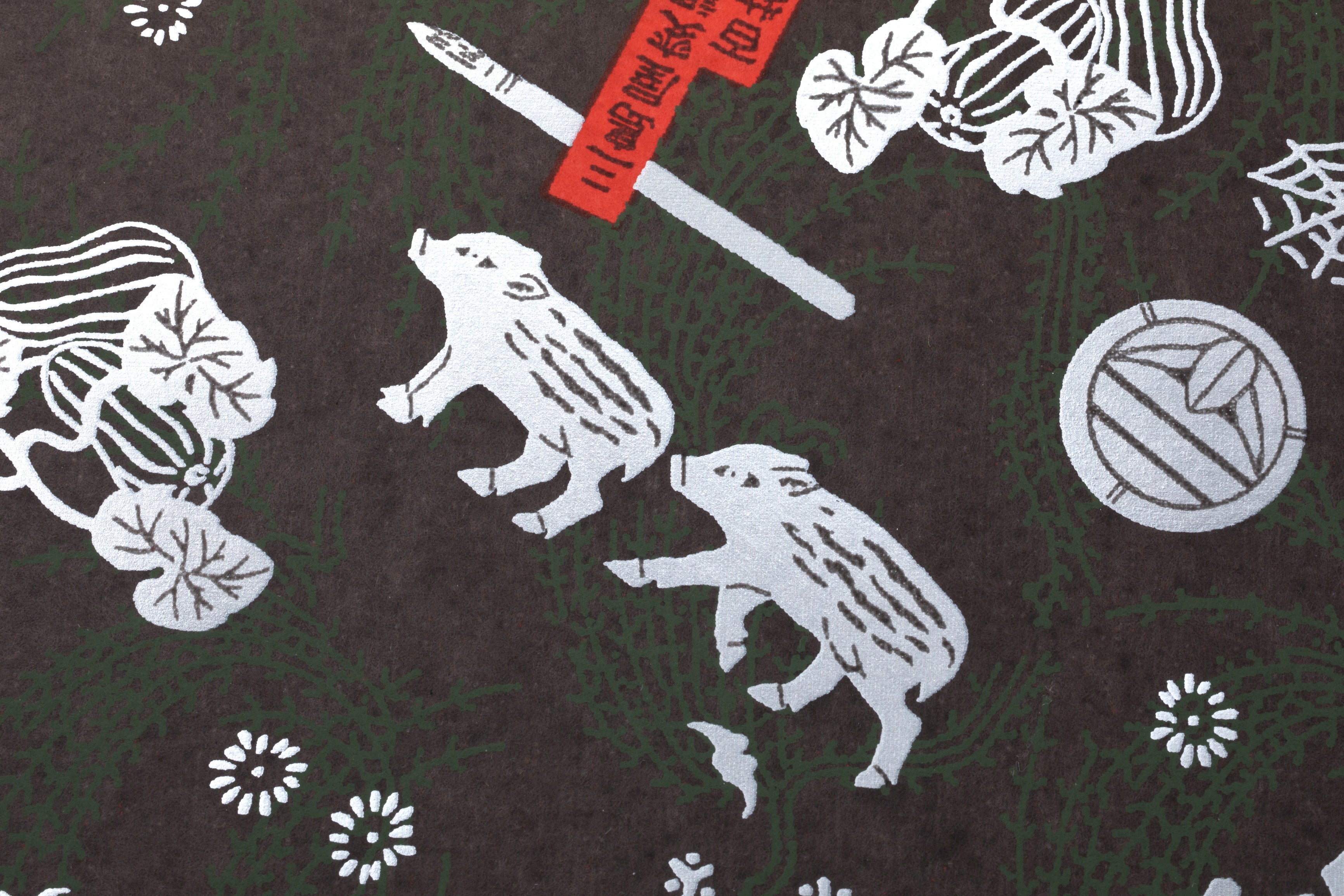 文箱、ノート、手鏡には、創業200年の歴史をもつ老舗・和紙舗「榛原(はいばら)」が、本グッズのために特別に作製した和紙を使用。榛原で所蔵する伝統的な柳の絵柄と、『青瓜不動』の新聞連載時の挿絵を組み合わせた、あやしさと可愛さを兼ね備えたデザインです。暗い背景に千海博美氏の版画が銀色に光ります。
