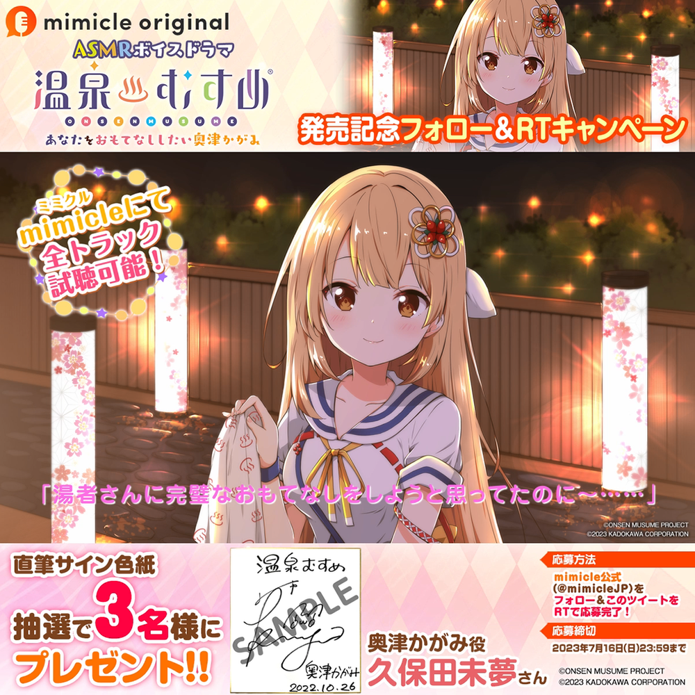 『ASMRボイスドラマ 温泉むすめ あなたをおもてなししたい奥津かがみ』の発売を記念してフォロー&RTキャンペーンを開催。キャンペーン期間中にmimicle公式(@mimicleJP)をフォローしたうえでキャンペーンツイートをリツイートすれば応募完了となります。抽選で3名様に「奥津かがみ役 久保田未夢さん直筆サイン色紙」をプレゼントいたします。