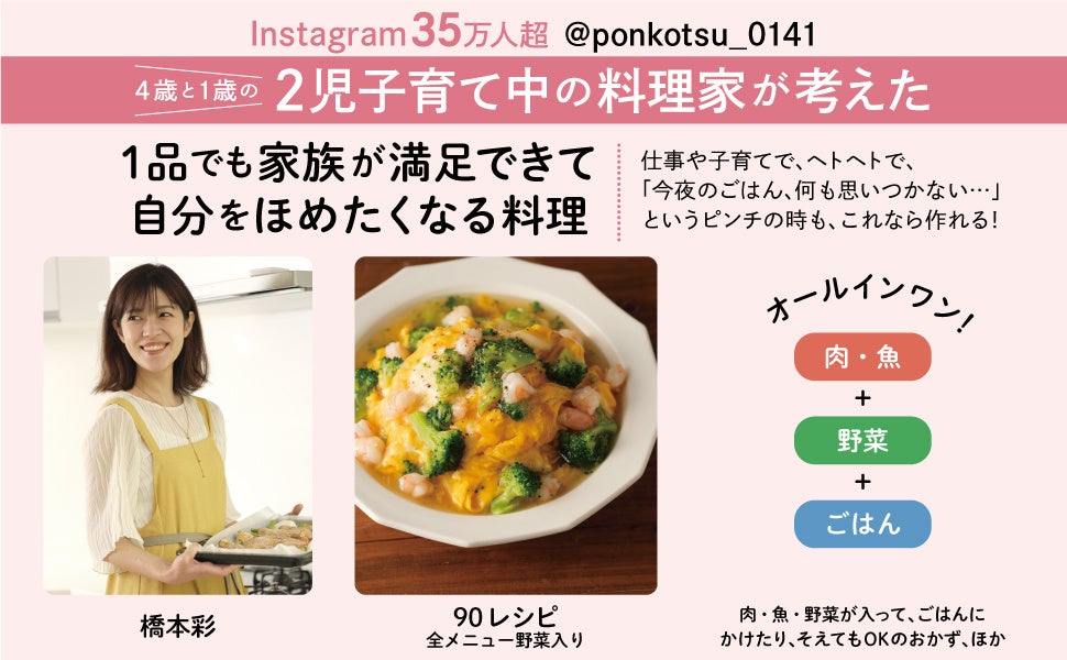 Instagramフォロワー35万人超、4歳と1歳の2児子育て中の料理家が考えた、「今夜のごはん、何も思いつかない……」というピンチの時にも頼れるレシピ本登場!