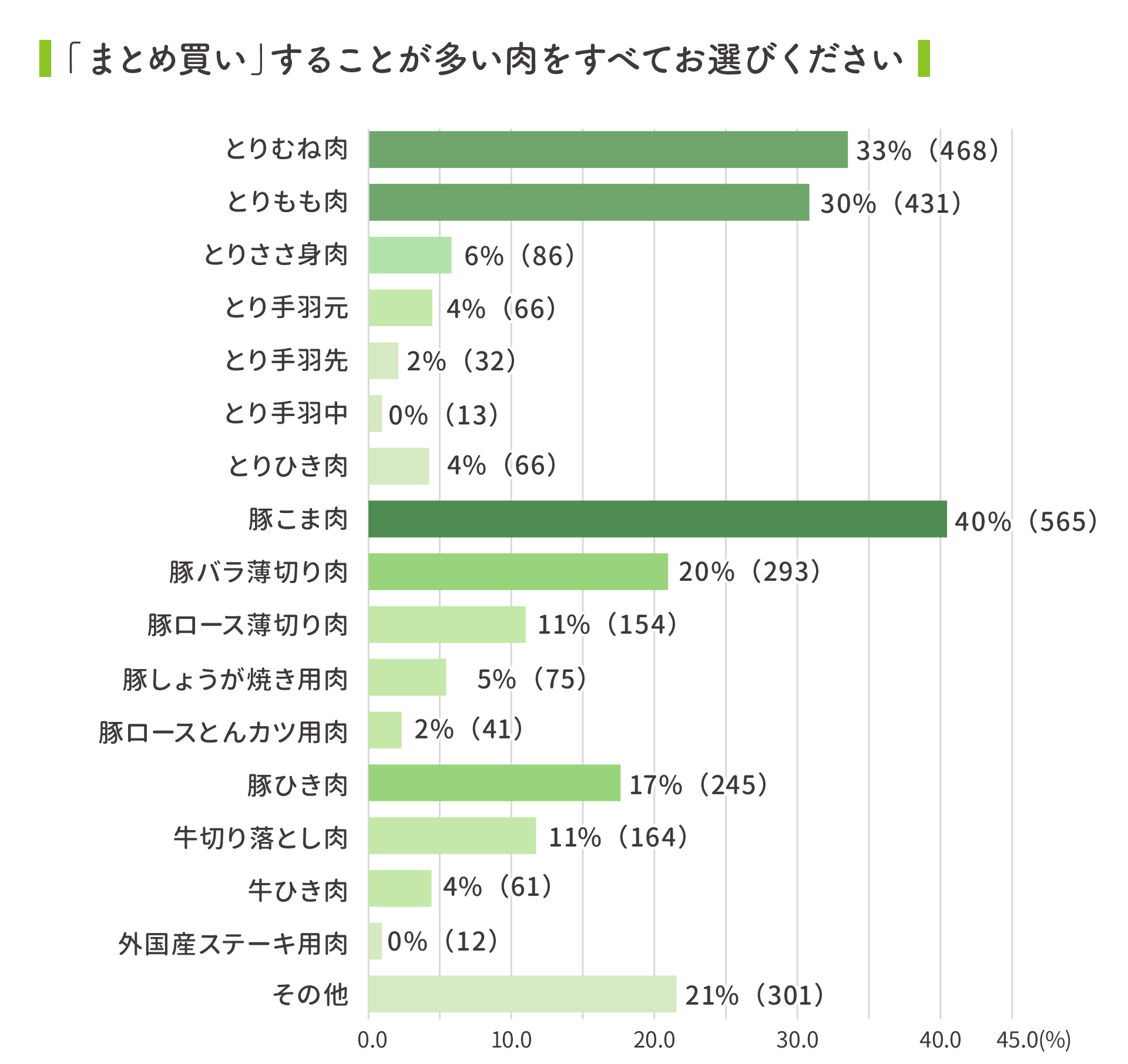 「豚こま肉(40%)」「とりむね肉(33%)」「とりもも肉(30%)」が「まとめ買い」人気上位のコスパ肉。