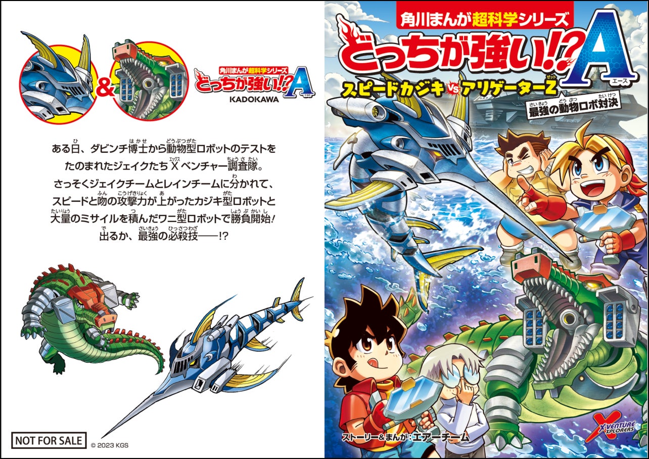 『どっちが強い!?A(3)海賊船の野望をあばけ』には、読者の皆様から募集した「夢の動物ロボ」最優秀賞2作品の対決を描き下ろしたまんが小冊子がついてきます。ここでしか見られない! スピードカジキ(カジキ型ロボット)とアリゲーターZ(ワニ型ロボット)の対決を収録しています。