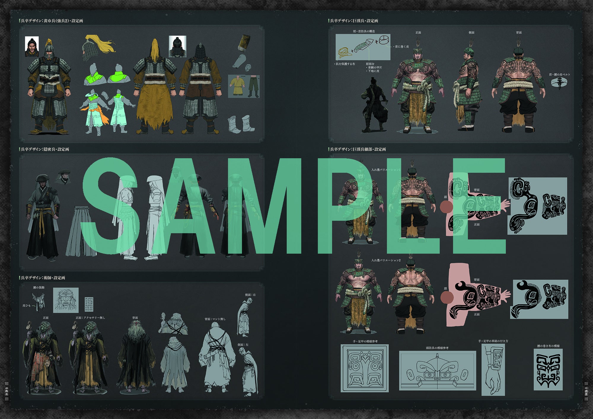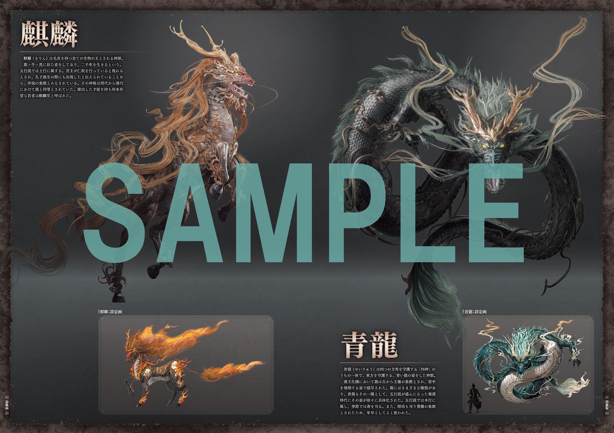 本作に登場する目覆いの少年、“紅晶”、“趙雲”らのNPCキャラクターをはじめ“劉備”、“曹操”、“袁紹”など名だたる武将たちのビジュアルはもちろん“麒麟”、“青龍”などの神獣たち、さらに“饕餮(とうてつ)”といった妖魔たちの荒々しくも美しいグラフィックを解説つきで収録しています。