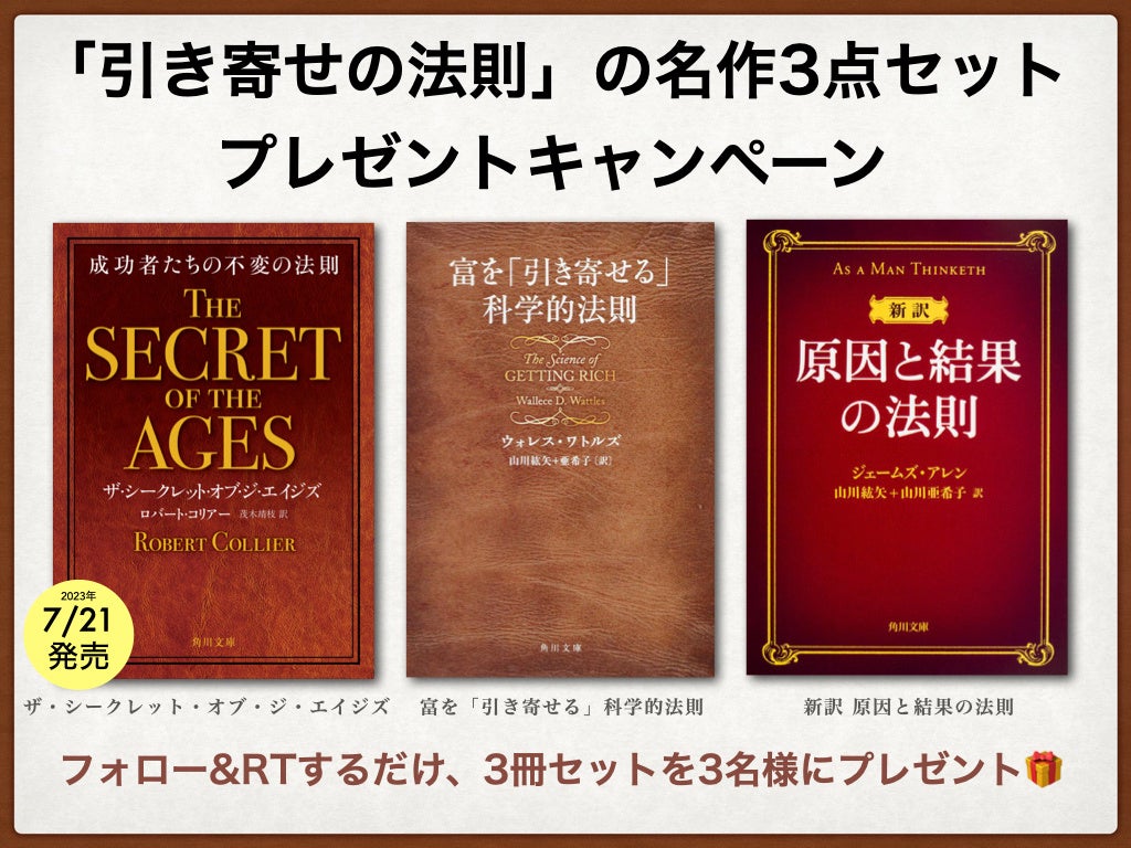 ・プレゼント賞品 1. ロバート・コリアー『ザ・シークレット・オブ・ジ・エイジズ 成功者たちの不変の法則』 2. ウォレス・ワトルズ『富を「引き寄せる」科学的法則』 3. ジェームズ・アレン『新訳 原因と結果の法則』 の3冊セットを抽選で3名様にプレゼント! ・応募方法 (1)TwitterのKADOKAWA翻訳書籍公式アカウント「@kadokawahonyaku」をフォローする。(https://twitter.com/kadokawahonyaku) (2)所定のキャンペーンツイートをRT(リツイート)する。 (3)エントリー完了! ※あらかじめ注意事項をご確認のうえでご応募ください。