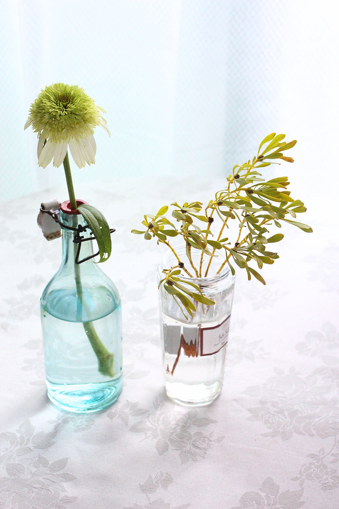 たっぷり飾られた花ほど豪華なものはありませんが、夏場は蒸れの原因になります。ギュウギュウに詰めて飾らず、適度な隙間をつくってあげましょう。写真のように1本ずつなら蒸れの心配はありません。