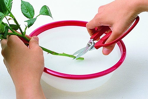 切り直すときは、茎や枝の変色した部分よりも上の位置で。変色した箇所はいわば壊死した状態なので、そこでカットしても水を吸い上げることはできません。水替え、茎の切り直しの際には、茎のヌメリも洗い流しましょう。