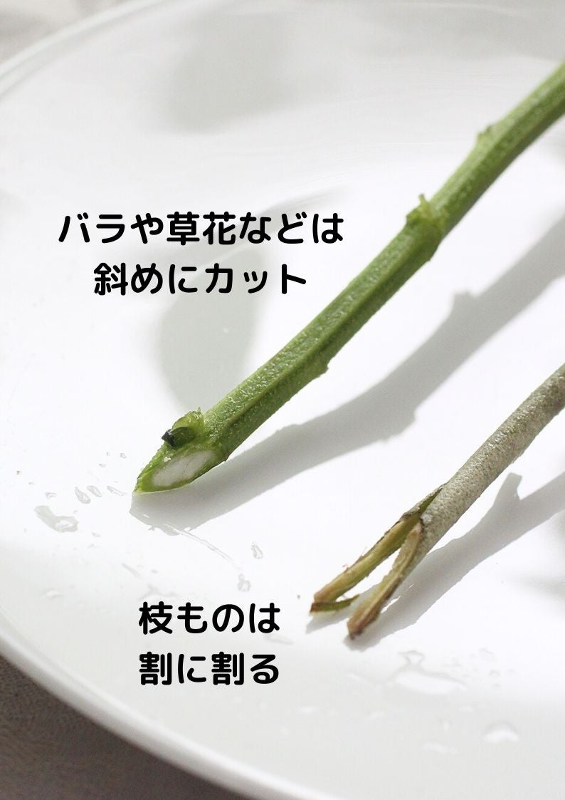 枝ものは写真のように、縦にハサミで割ることで水を吸い上げやすくなります。