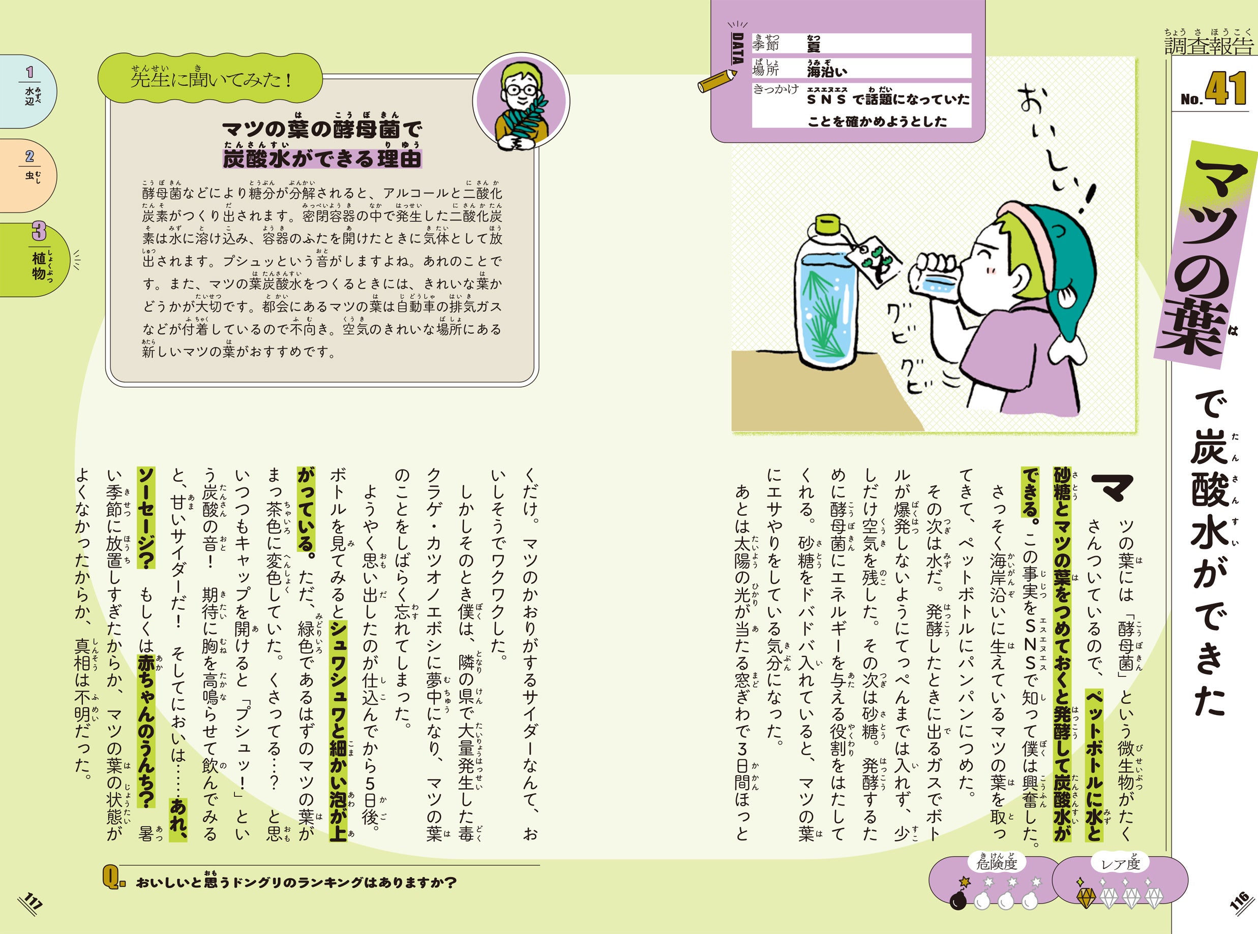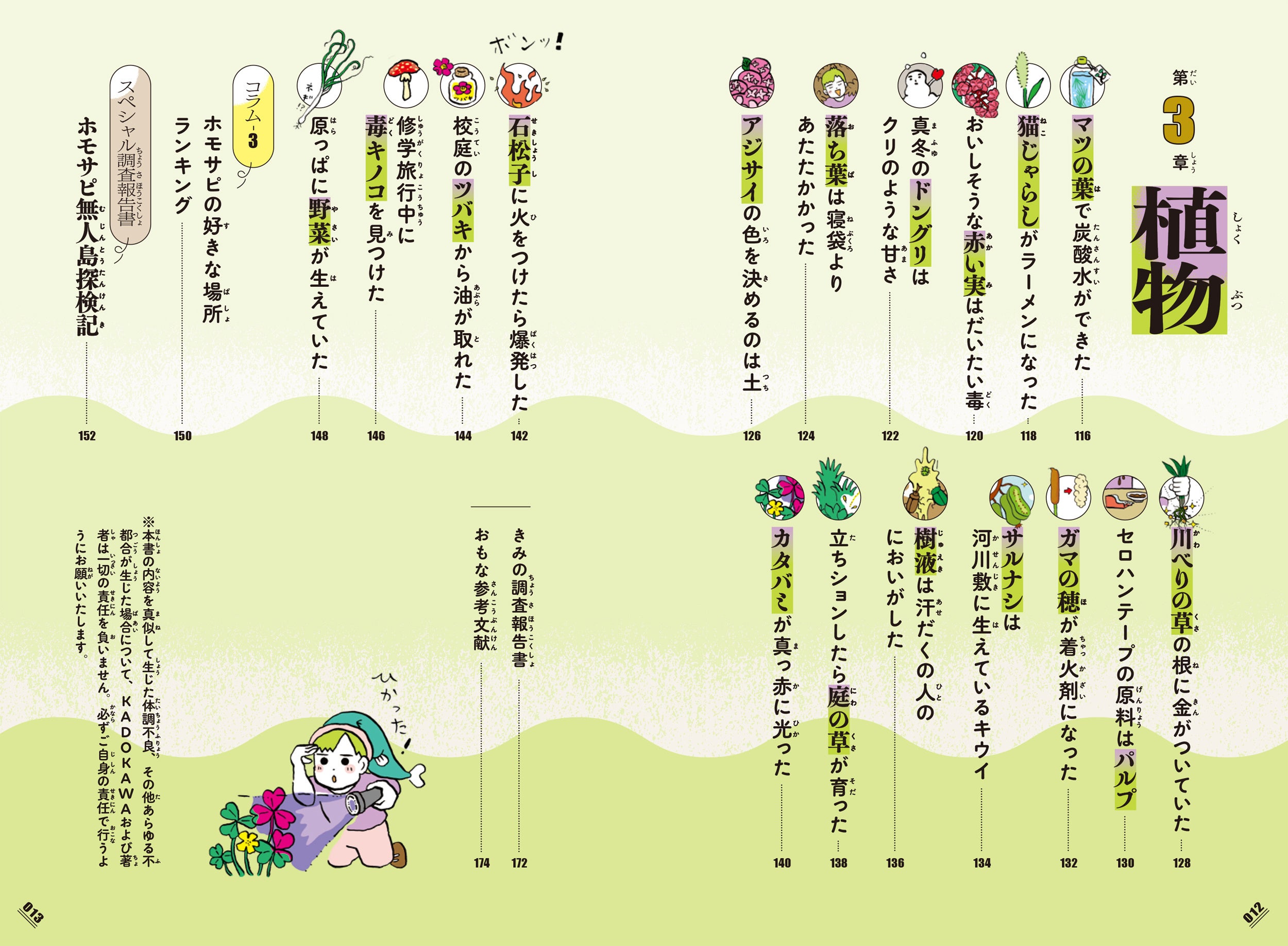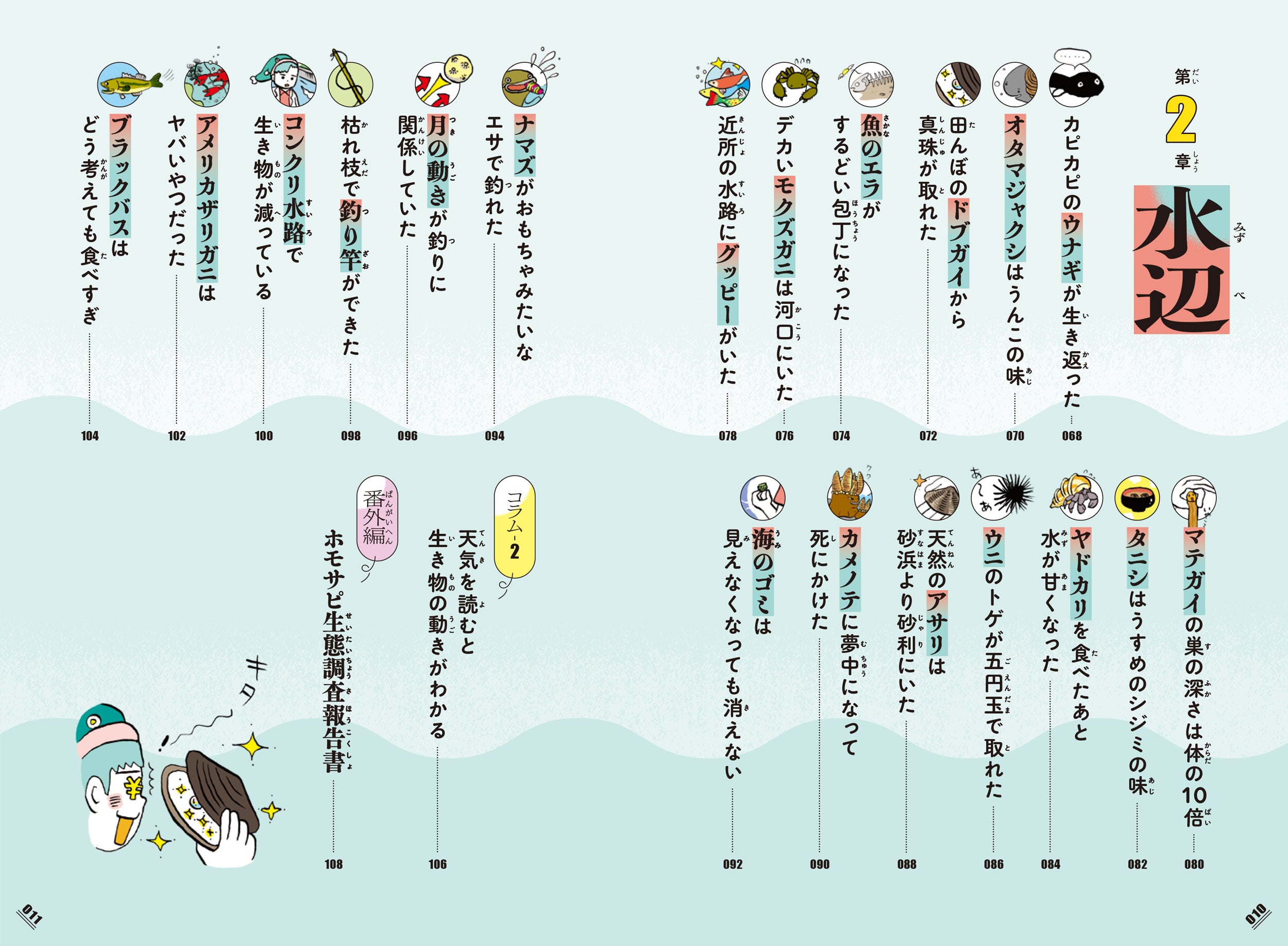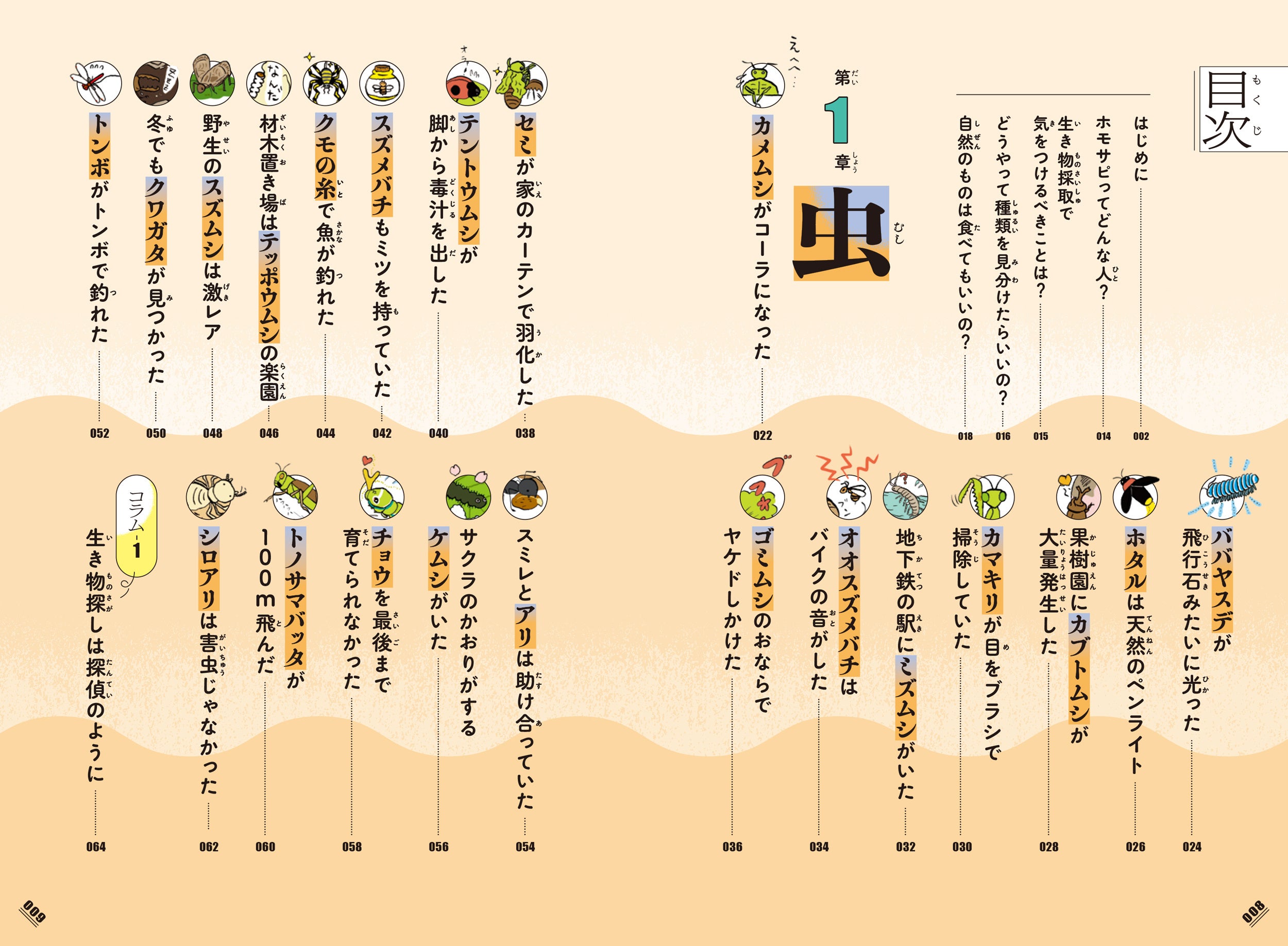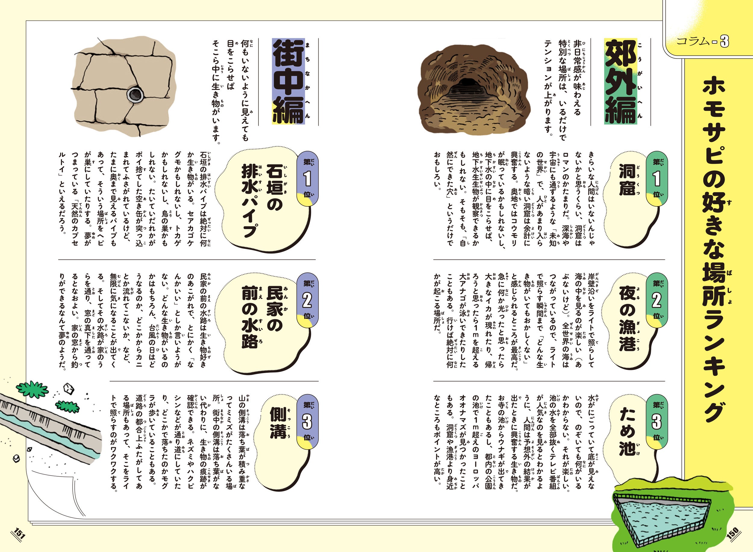 ホモサピが今まで体験してきたおもしろ体験をオールカラーのイラストつきで紹介しながら、虫・水辺・植物の3分野の先生たちがコラムで専門知識を補足します。