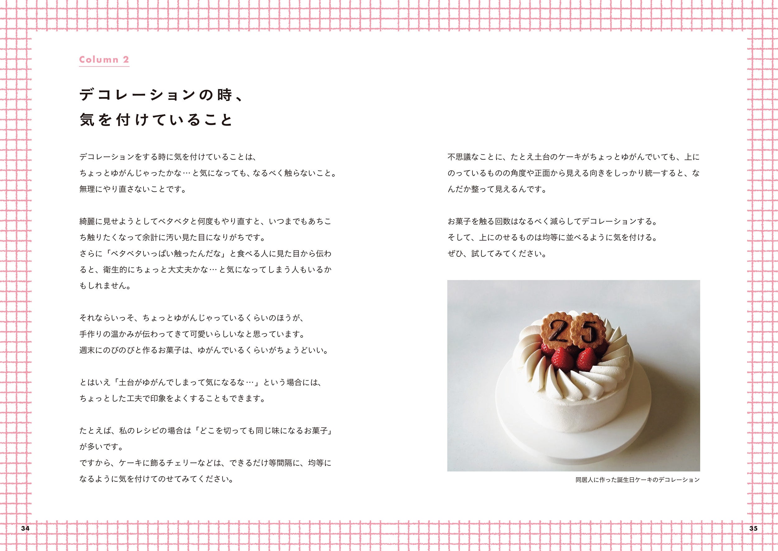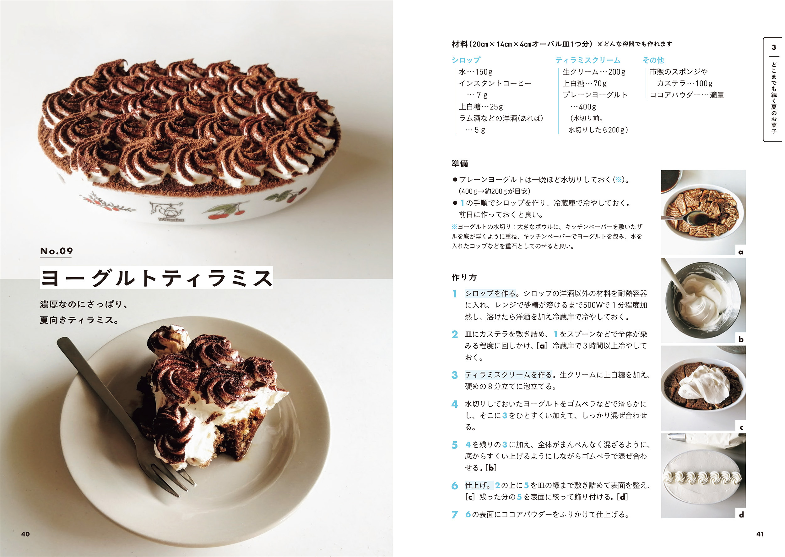 著者のルームシェア生活から生まれたレシピは、どれも素朴な温かみをまとった可愛らしいお菓子ばかり。ふかふかのミルクティシフォンや、歓声が上がるほど大きいプリン、夏にぴったりのヨーグルトティラミスなど、季節や気分に合わせて楽しめる30レシピを収録しています。