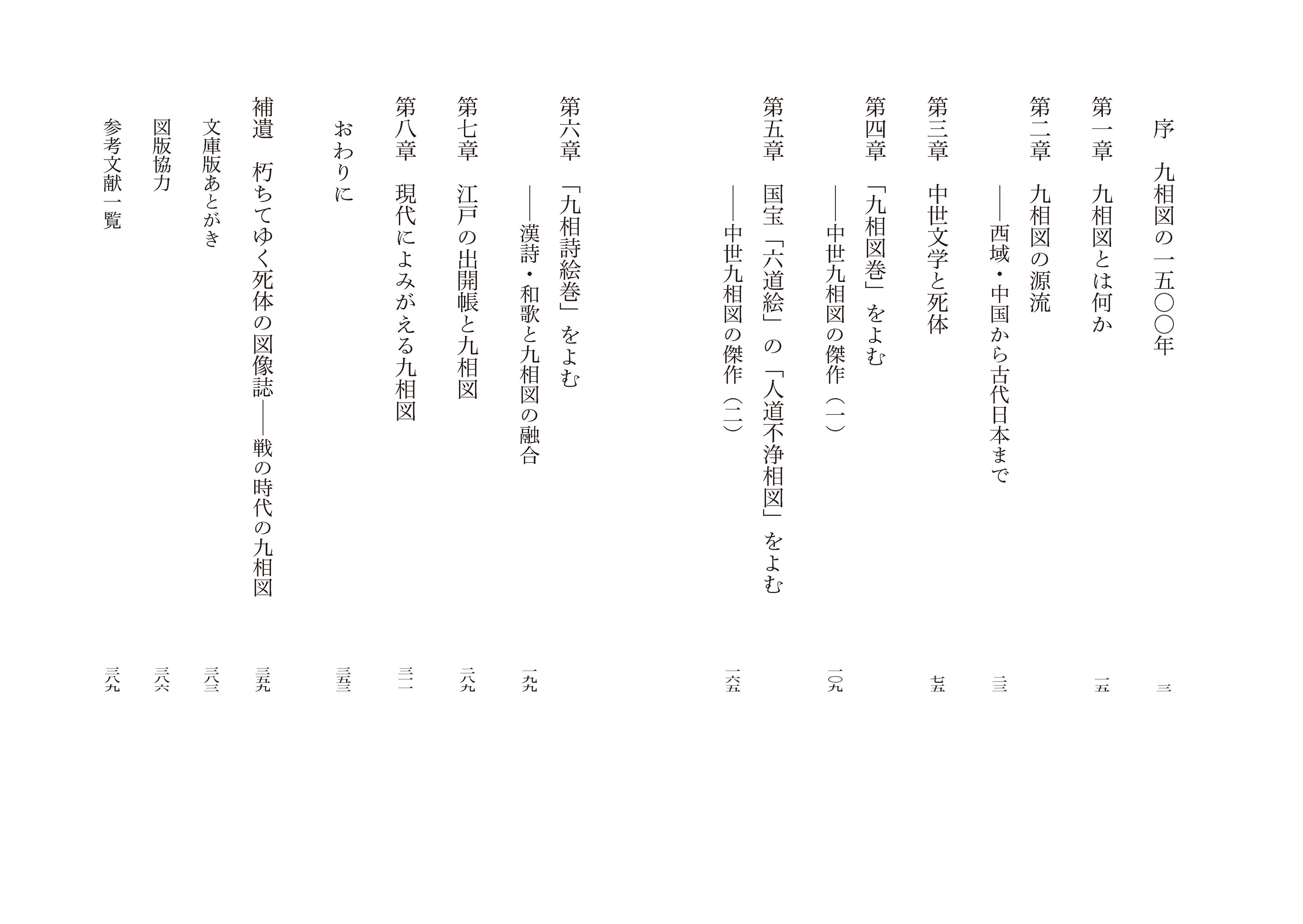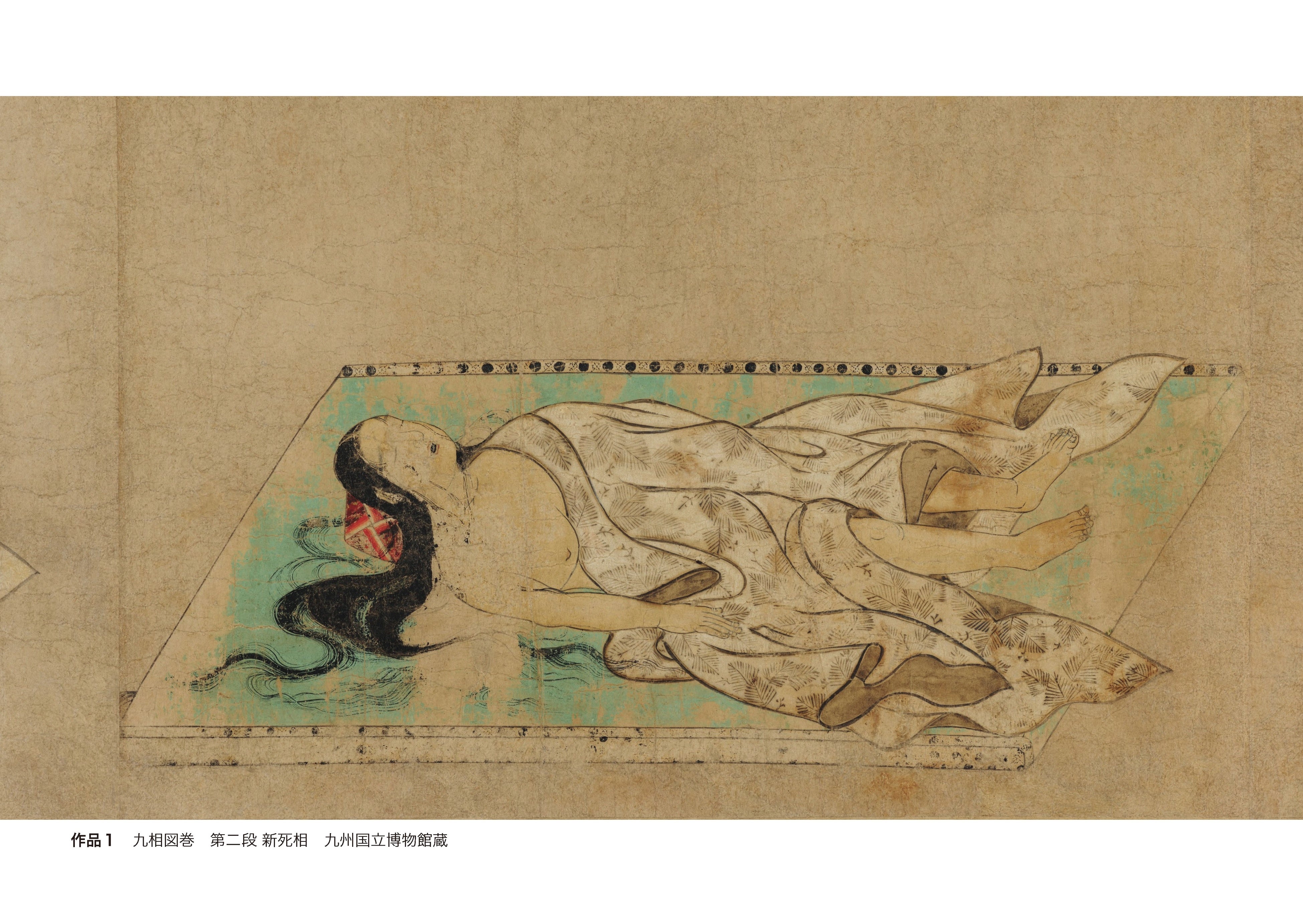 西域から中国を経て日本へ、東漸する仏教とともに一五〇〇年以上の時を超えて継承されたこの絵に祈りや願いを込めた多くの人々がいた。死体を描いた九つの相を凝視することで、生命のあやうさへの戸惑いや畏おそれが心を捉とらえる。九相図の向こう側には、生と死に対する諦念の思想が像を結ぶいっぽうで、相反する生への強い執着も見え隠れする。それはかつて九相図を見た人々の想いでもあり、今ここでこの絵を見ている自分自身の想いとなってたち現れる。