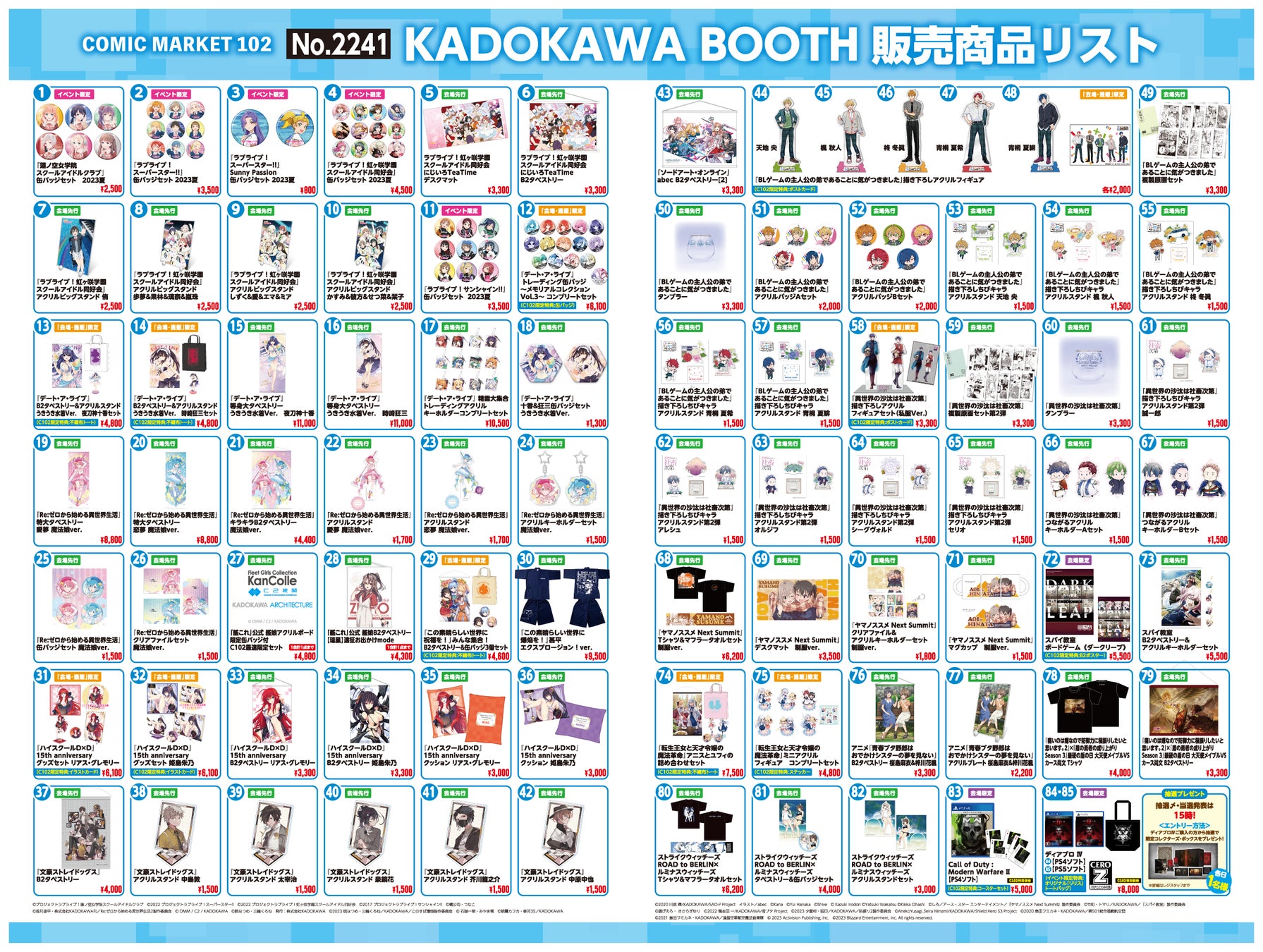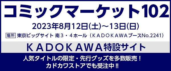<C102 KADOKAWAブース オンライン in カドカワストア> https://store.kadokawa.co.jp/shop/e/ec102000/ 期 間:2023年8月31日(木)23時59分までを予定 ※期間中、オンライン受注上限に達した商品はカドカワストア分のみ売切れ(受注終了)となります。 ※受注締切・お届け日は商品によって異なります。詳しくはカドカワストア内C102特設ページをご確認下さい。 |