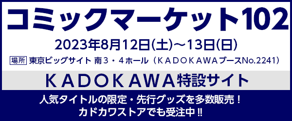 ブース :東京ビッグサイト 南3・4ホールNo.2241 期 間 : 2023年8月12日(土)~13日(日) https://event.kadokawa.co.jp/comiket/ ▽KADOKAWAイベント情報Twitter(@kadokawa_event) https://twitter.com/kadokawa_event ※内容に関して、変更や中止となる場合があります
