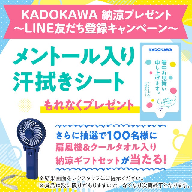 <KADOKAWAグッズ情報局>LINEアカウントの友だち登録者に、C102KADOKAWAブース限定でメントール入り汗拭きシートをプレゼント! さらに抽選で100名様にハンディ扇風機&クールタオルが入った「納涼ギフトセット」が当たります!ぜひご参加ください。