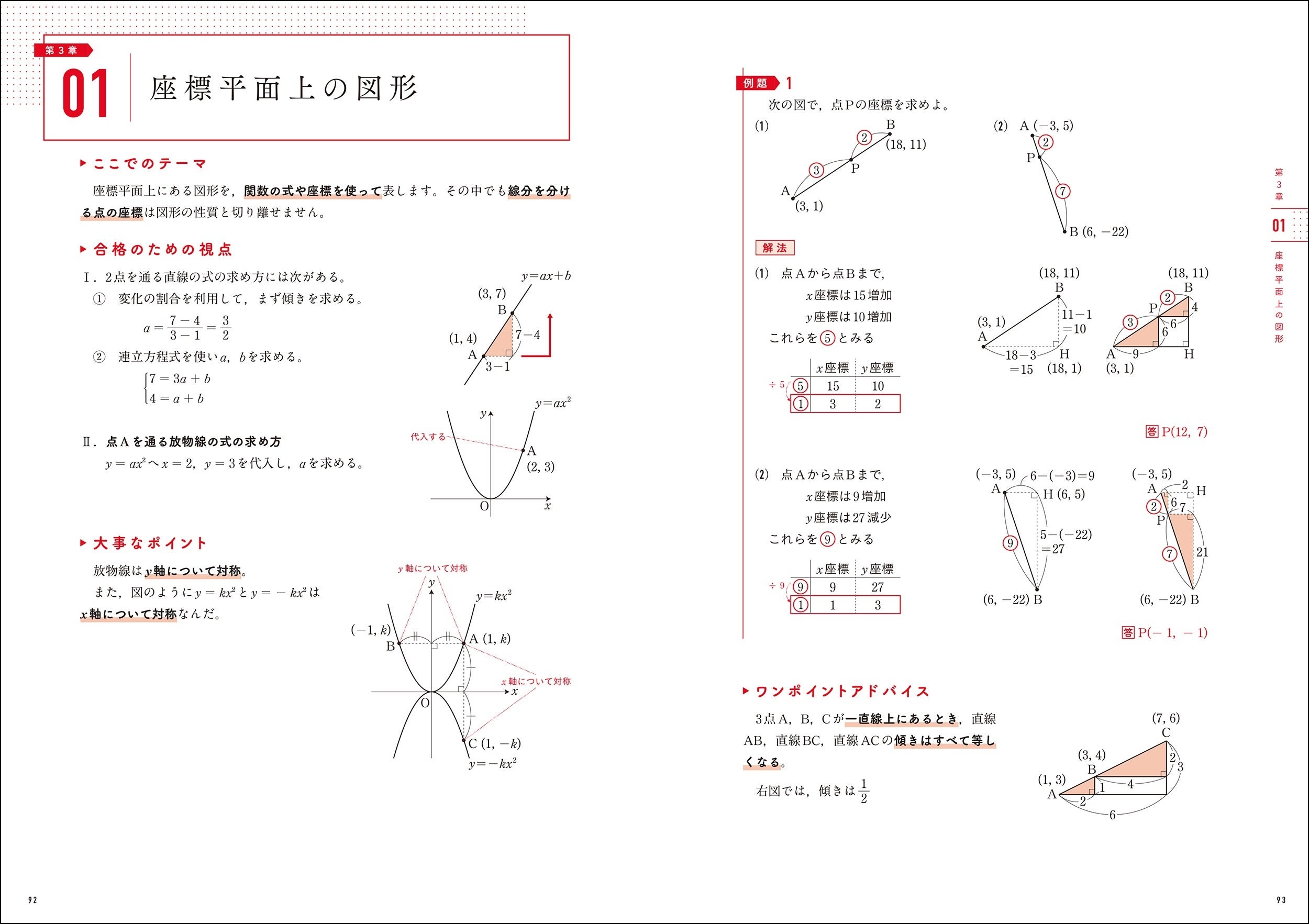 本書の構成は、単元ごとに徐々にレベルアップしていく形になっています。まず、それぞれの単元に置かれた導入部分は公立高校入試をターゲットとしています。徐々にその解法に肉付けしていくことで、難関私立入試への対策もできるようになっています。