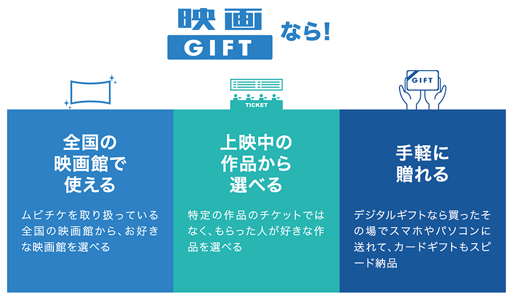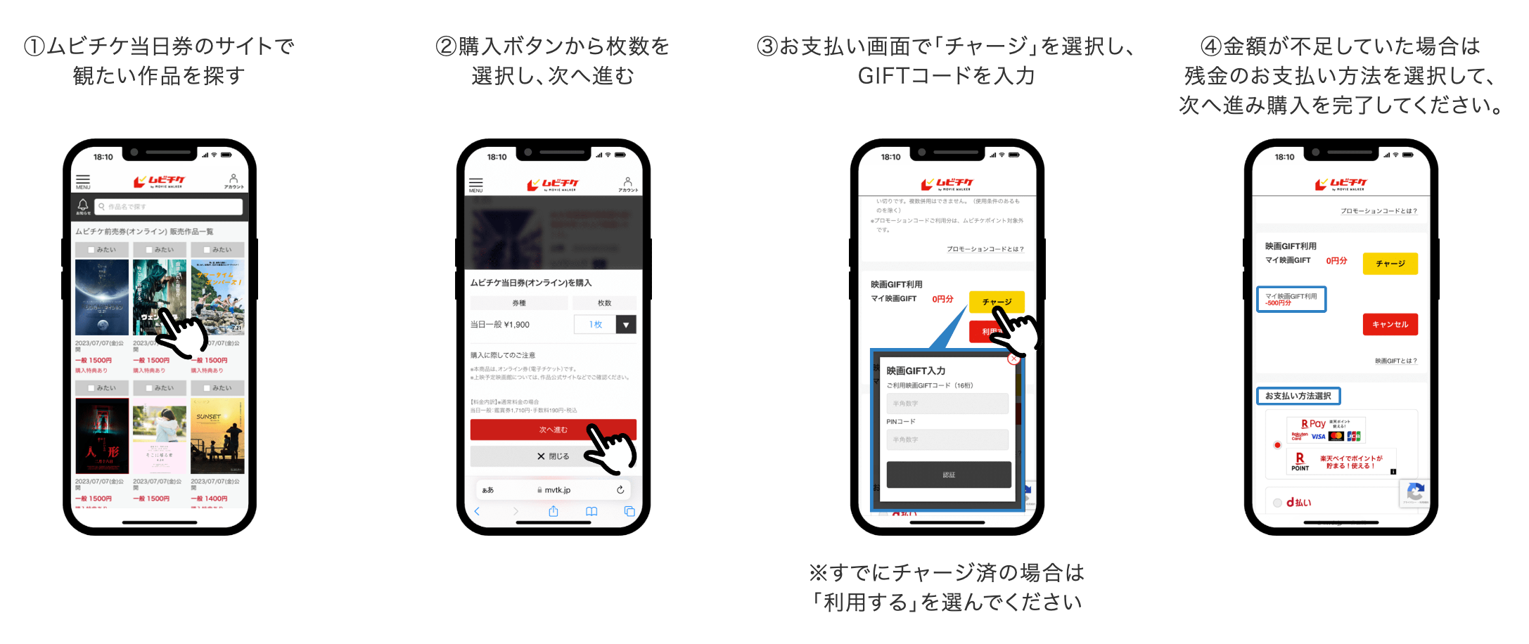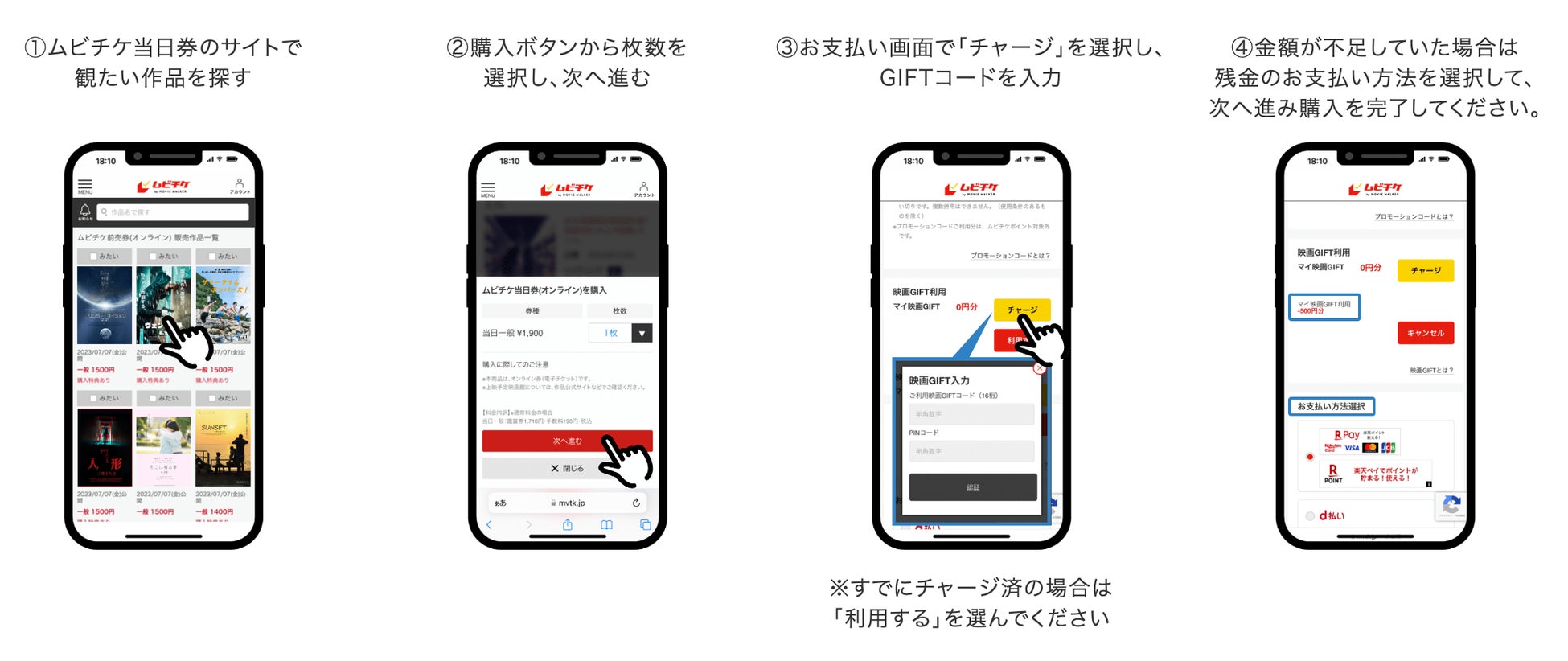 デジタル鑑賞券「ムビチケ当日券」の購入の利用方法、映画館の座席指定方法、おさいふのような機能の「マイ映画GIFT」にチャージする方法など、使い方例も交えて詳しくご説明しています。