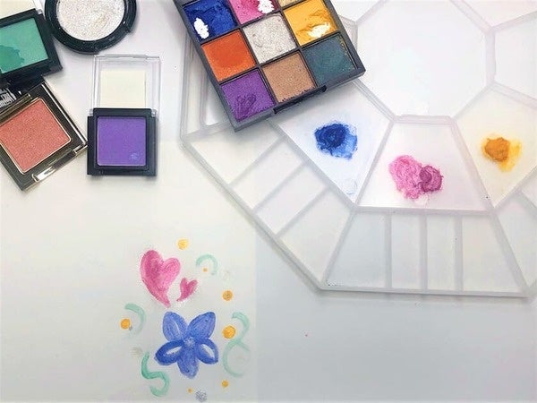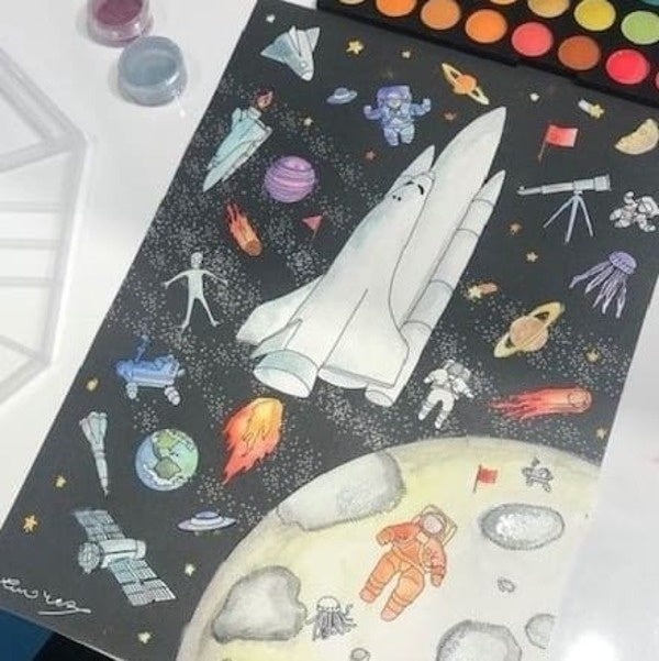 使わなくなったアイシャドウを絵の具にアップサイクルするワークショップ。日本初の航空機専用飛行場が開設された地として知られる所沢で、“宇宙”をテーマにしたA4サイズの塗り絵を体験いただきます。塗り絵の台紙はシールになっているので、絵柄ごとにハサミで切って楽しむこともできます。