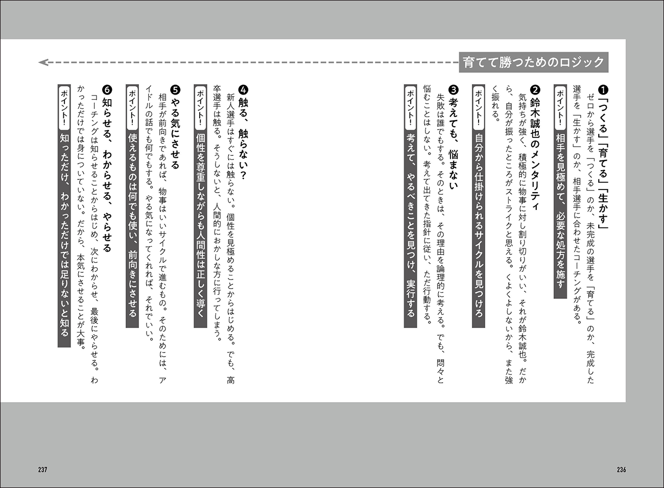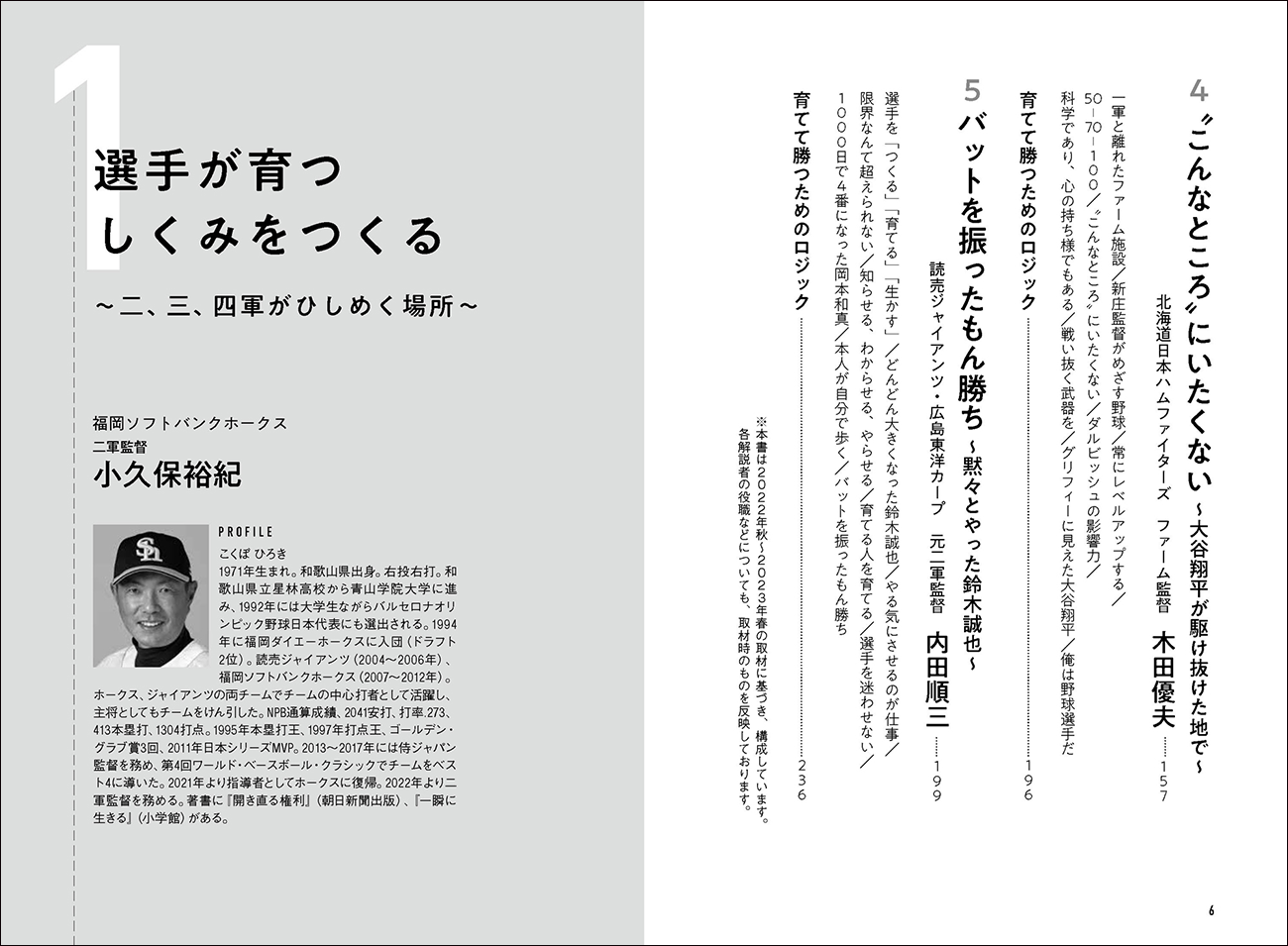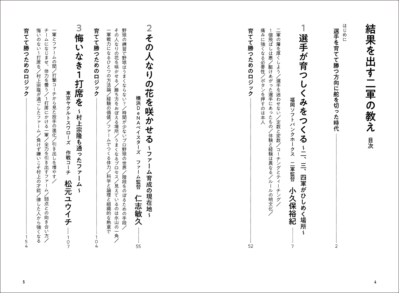 福岡ソフトバンクホークス・二軍監督の小久保裕紀氏、横浜DeNAベイスターズ・ファーム監督の仁志敏久氏、東京ヤクルトスワローズ・作戦コーチの松元ユウイチ氏、北海道日本ハムファイターズ・ファーム監督の木田優夫氏、読売ジャイアンツ、広島東洋カープ・元二軍監督の内田順三氏の5人の指導者が、それぞれの経験をもとに、育てて勝つためのロジックを語っています。