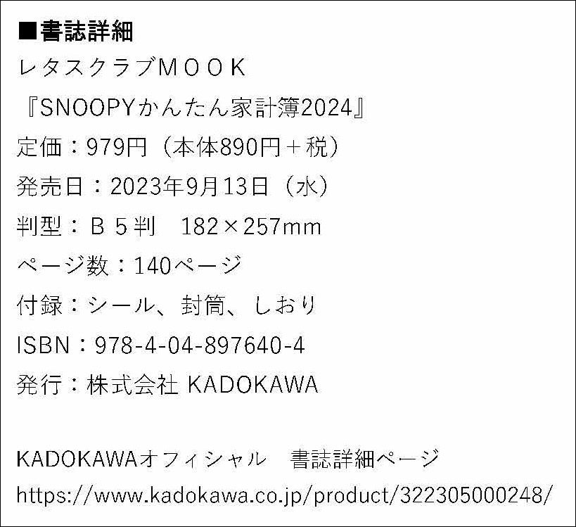 ■書誌詳細 レタスクラブMOOK 『SNOOPYかんたん家計簿2024』 定価:979円(本体890円+税) 発売日:2023年9月13日(水) 判型:B5判 182×257mm ページ数:140ページ 付録:シール、封筒、しおり ISBN:978-4-04-897640-4 発行:株式会社 KADOKAWA KADOKAWAオフィシャル 書誌詳細ページ |
