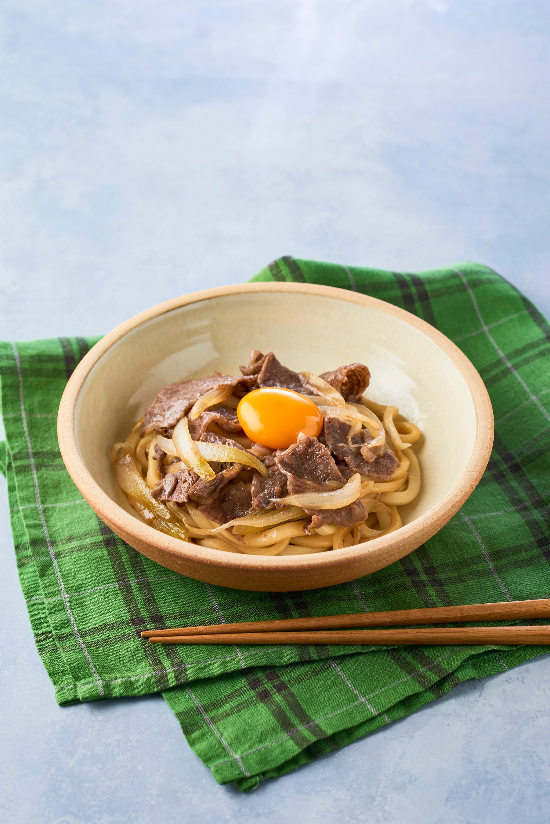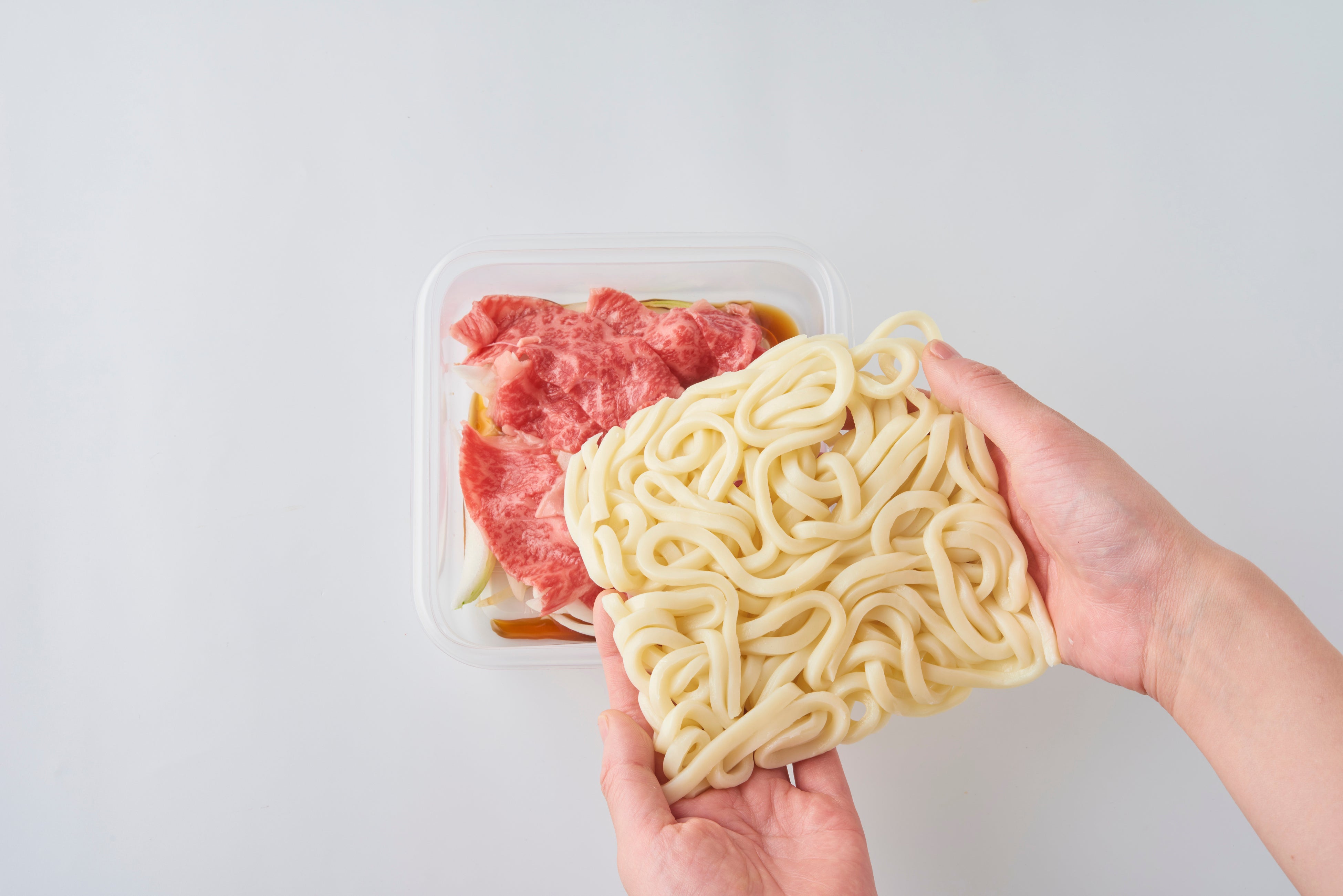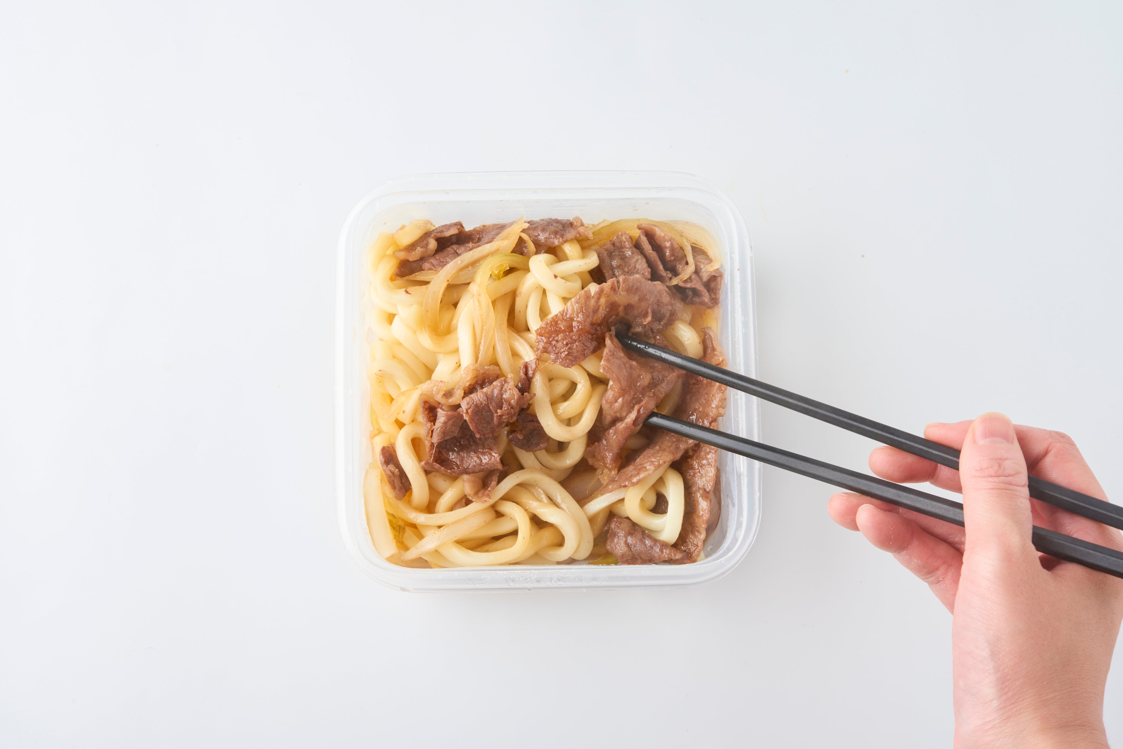 たとえば、上記写真の「すき焼き風うどん」。手順は驚くほど簡単で、耐熱容器に調味料、牛薄切り肉、うどん、玉ねぎの順に入れたら、ふんわりラップし、600Wのレンジで4分加熱するだけ!