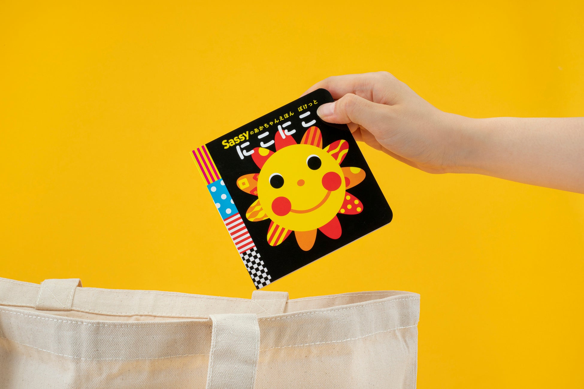 『Sassyのあかちゃんえほん ぽけっと にこにこ』は、シリーズで一番人気の『にこにこ』を、内容はそのまま、持ち歩きやすいサイズにしたミニ絵本です。