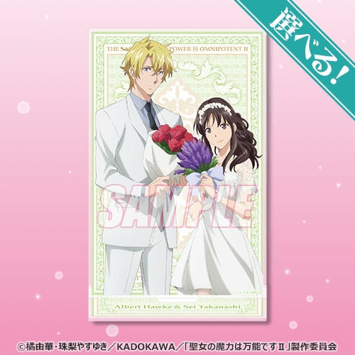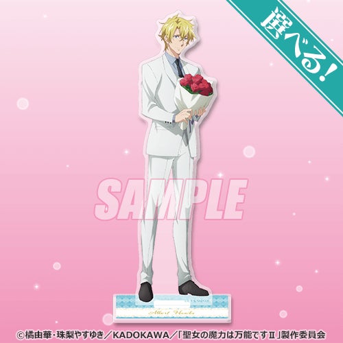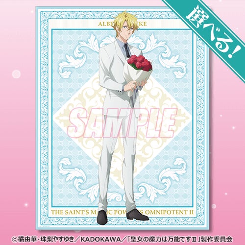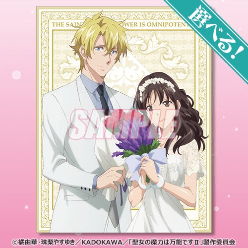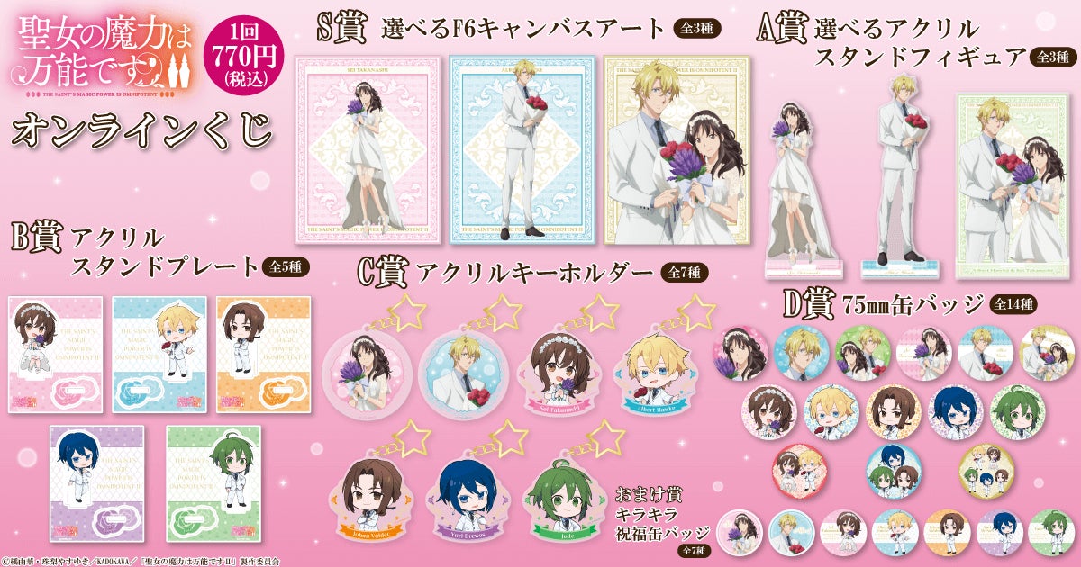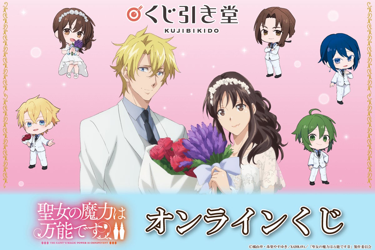 TVアニメ「聖女の魔力は万能です Season2」がくじ引き堂に登場! アルベルトとセイが白のスーツとドレスに身を包み、花束を抱えている美しい描きおろしイラストを使用した豪華景品が盛りだくさん!!