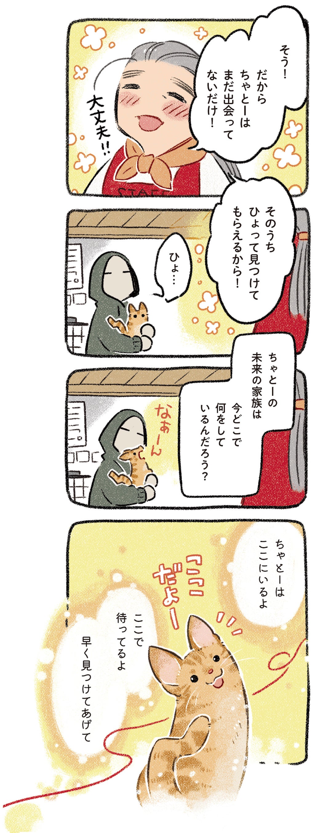 家の庭に引っ越してきてしまった野良猫4匹「むー」「うちゃ」「ちっぽ」「ちゃとー」と、夜のコンビニに捨てられていた「ナッツ」のお話。見た目や条件が合わずに断られては、また里親探しに譲渡会に出る日々。このまま自分が飼えたらいいけれど……と無力さを感じながらも、良いご縁を探します。