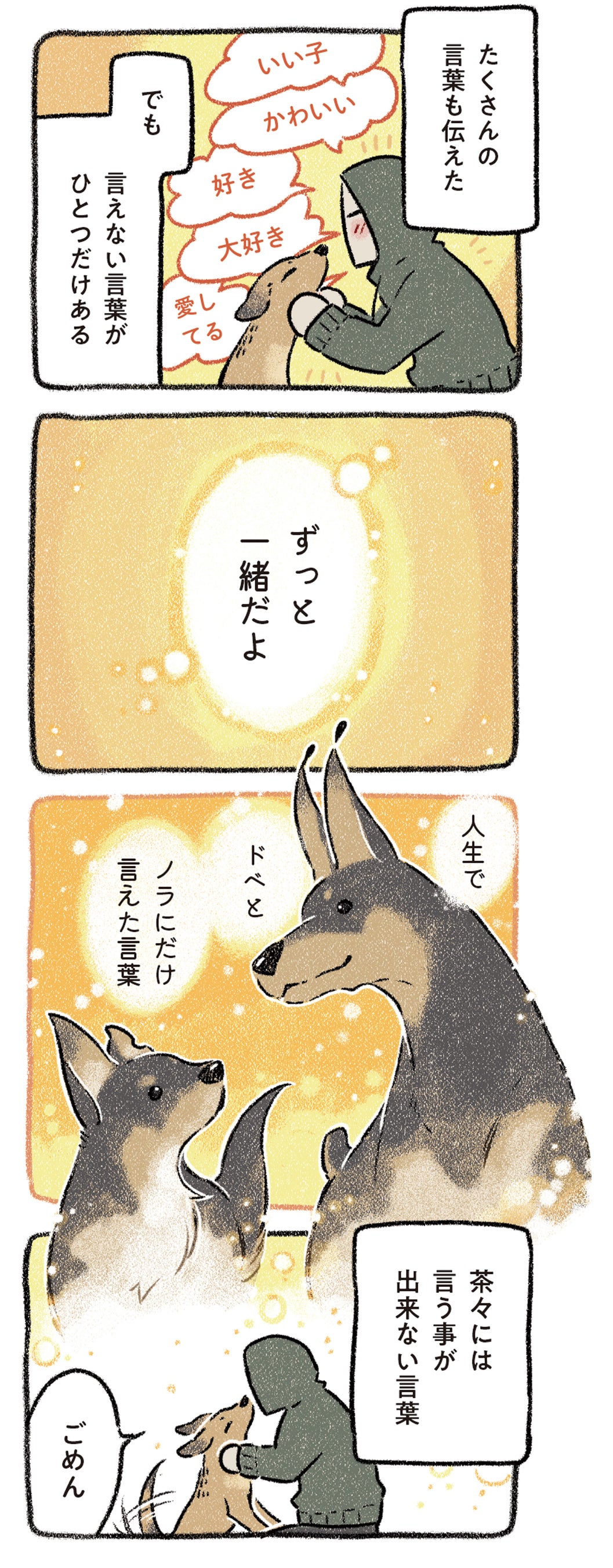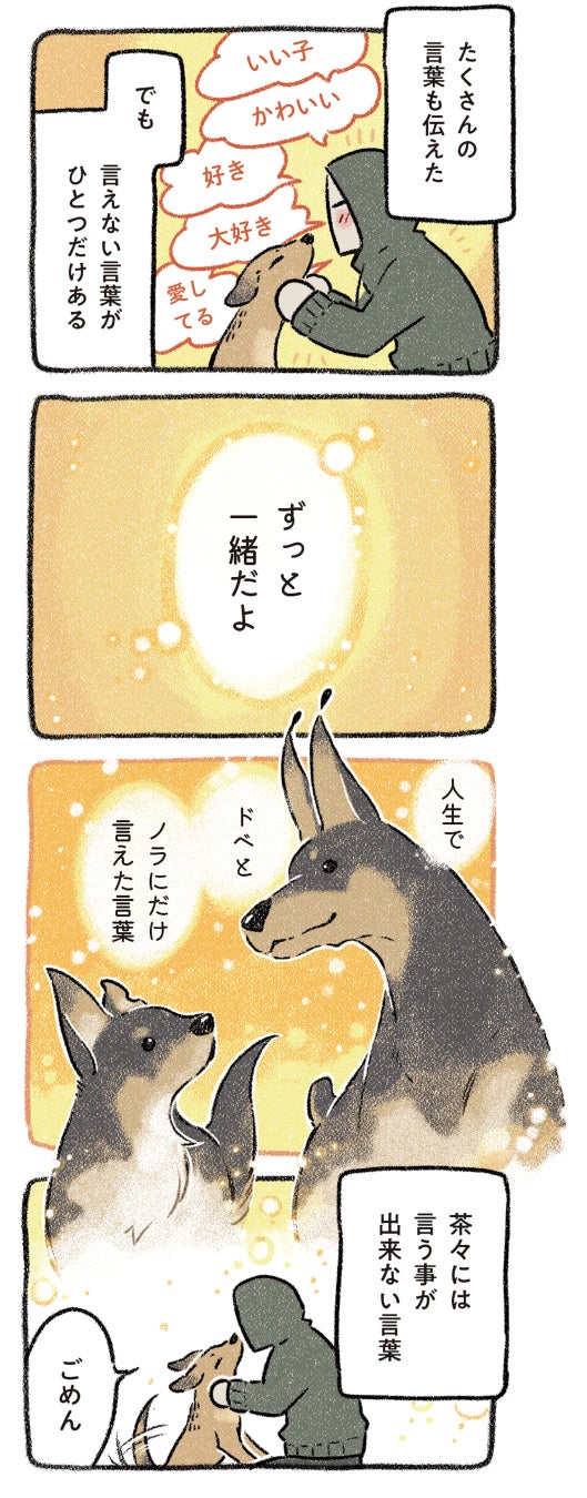 もちろん今作でも、やんちゃなドベとノラの心温まるエピソードも満載! 犬飼いさんもそうでない方も、ぜひご縁を感じて、読んで幸せな気持ちになってもらいたい作品です。
