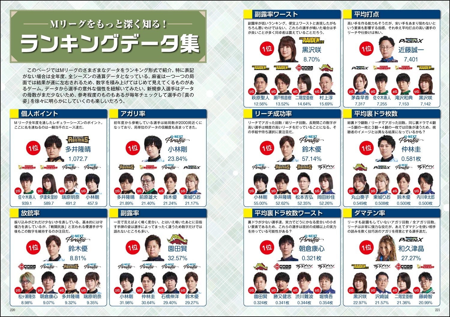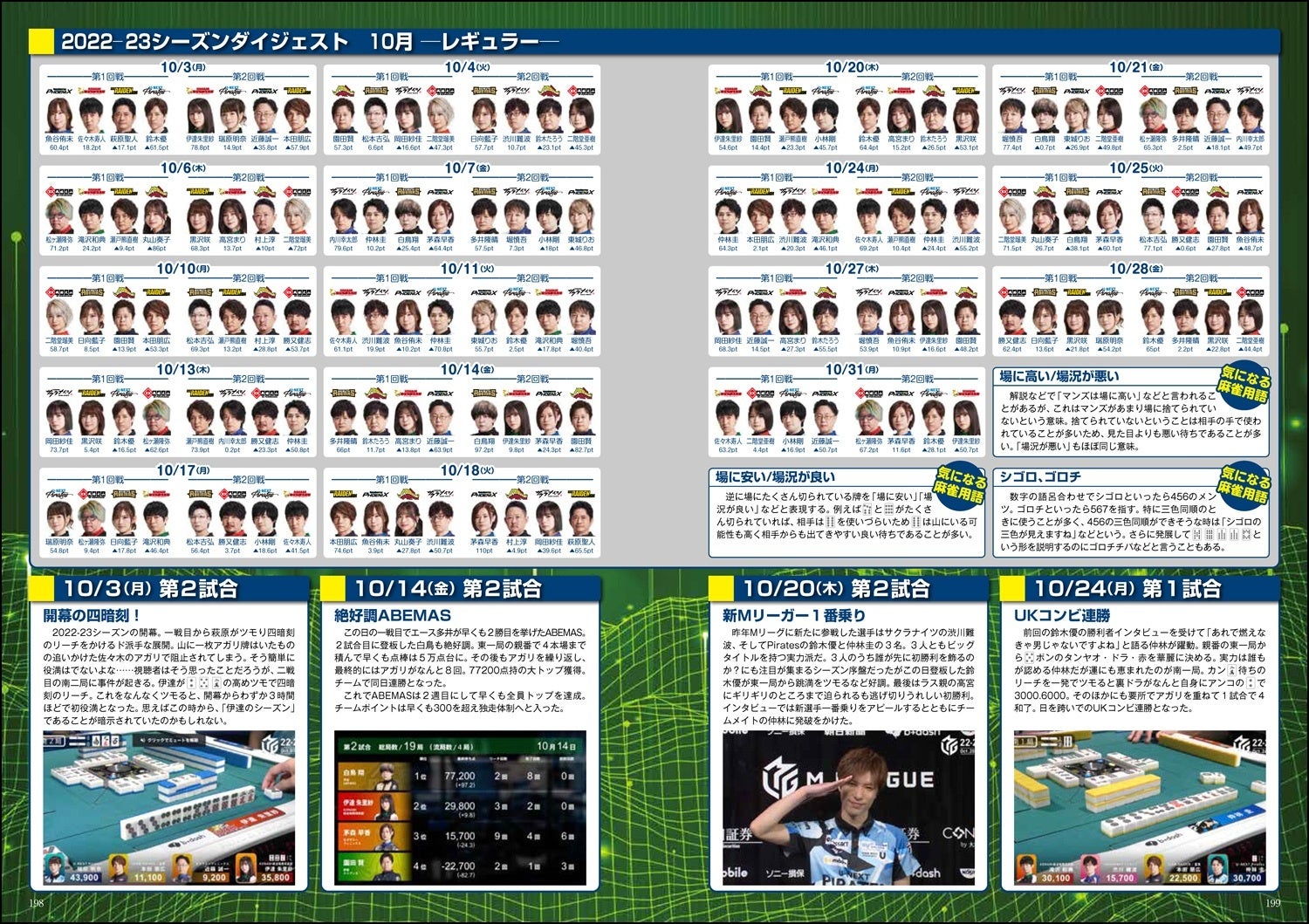 本書では、最高峰の麻雀リーグ「Mリーグ」の仕組みや年間スケジュールなどの基礎情報、今シーズンの各チームの選手紹介、各選手の麻雀の特徴はもちろん、実況や解説者によるコラム、前シーズンの結果一覧まで、Mリーグを隅々まで解説しています。