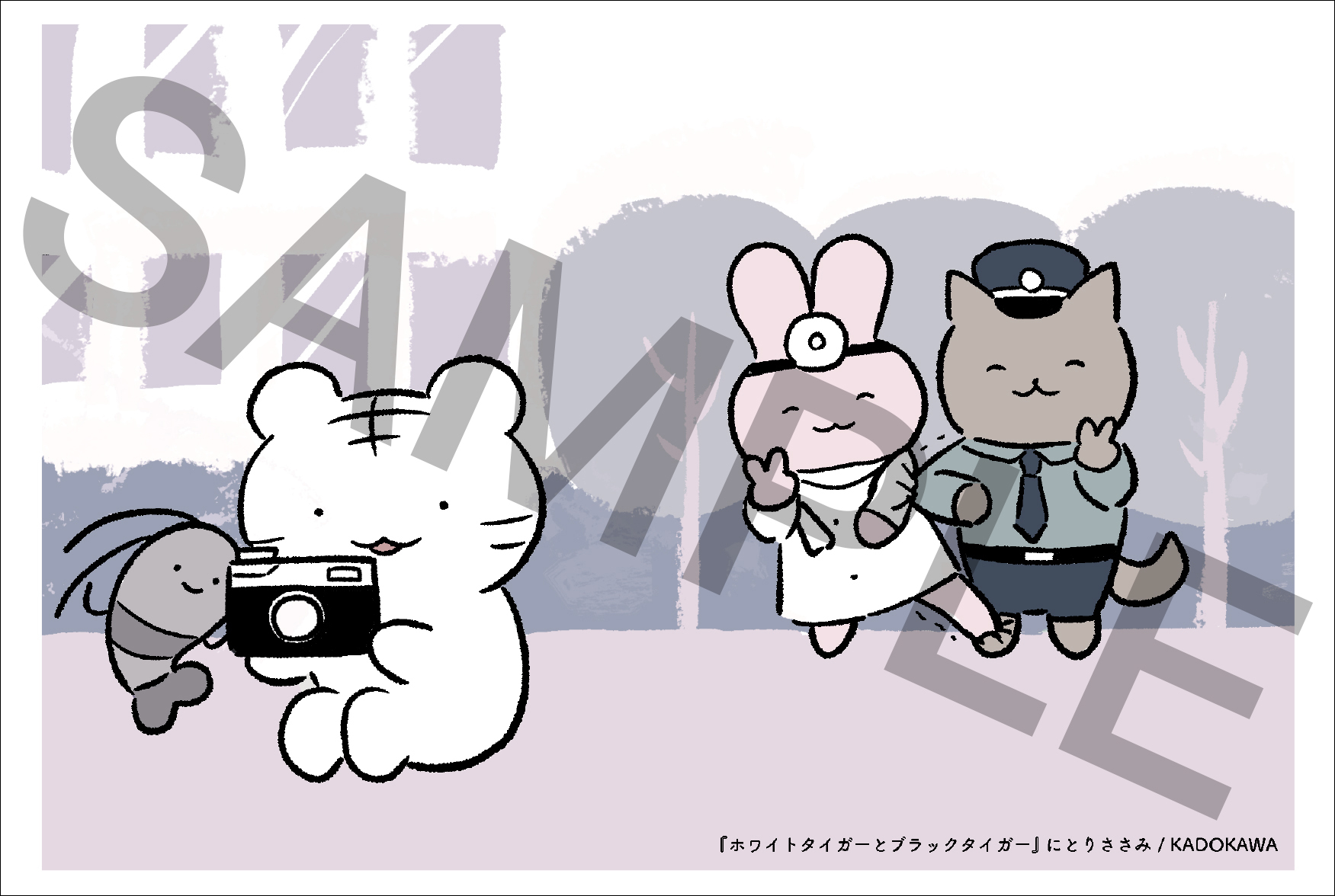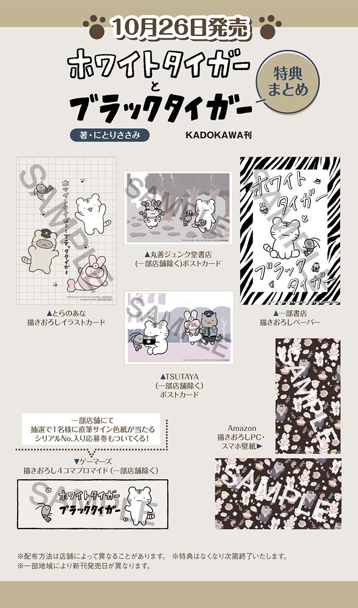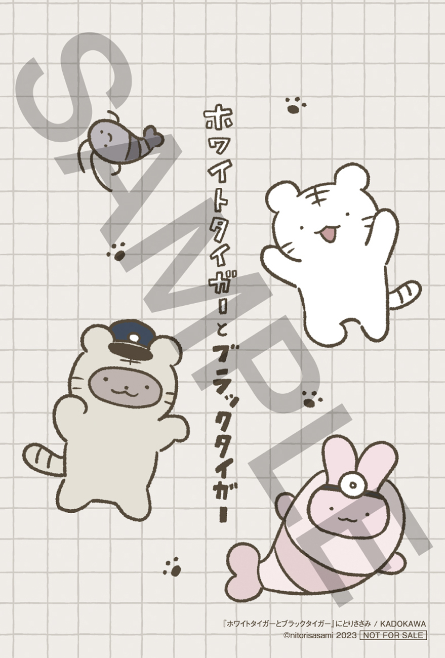 ・一部店舗にて抽選で1名様に、にとりささみ先生直筆サイン色紙が当たるシリアルNo.つき抽選応募券を『ホワイトタイガーとブラックタイガー』購入のお客様に配布。