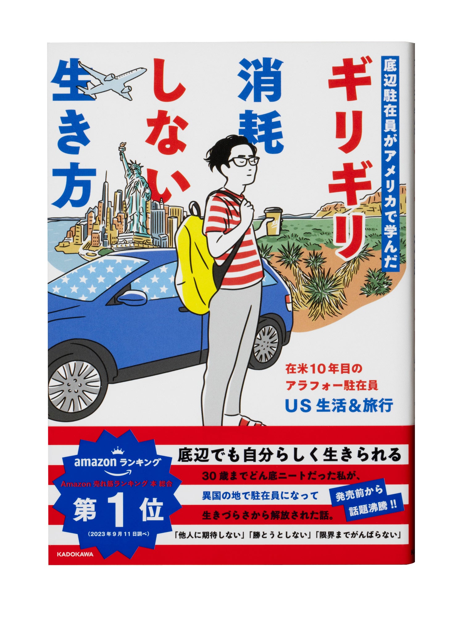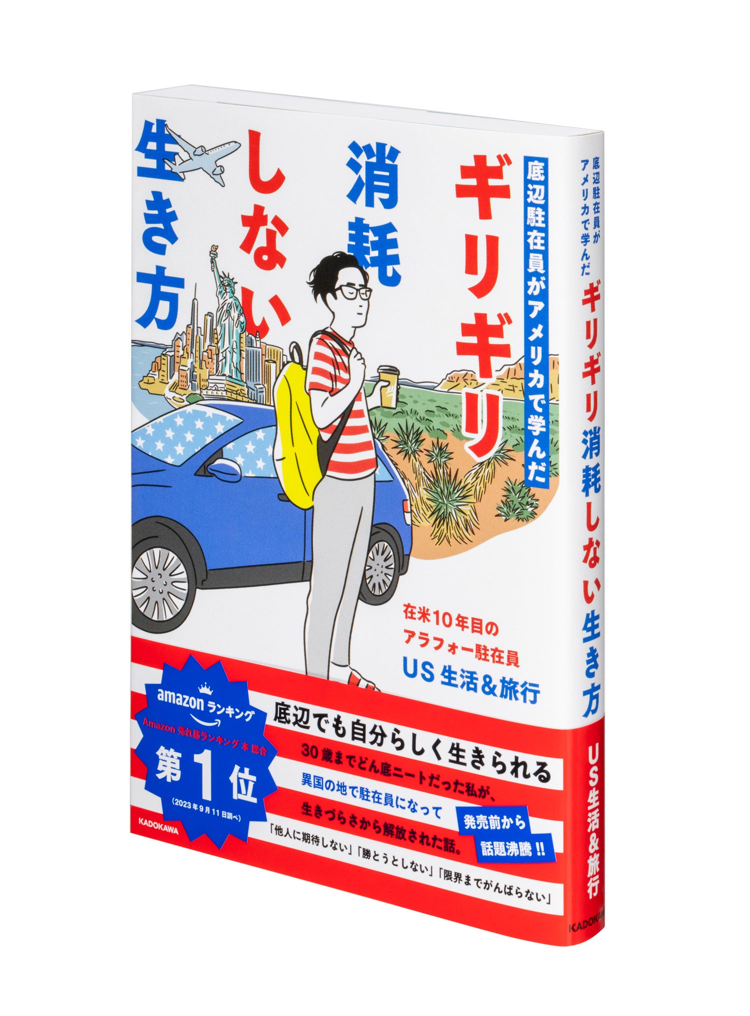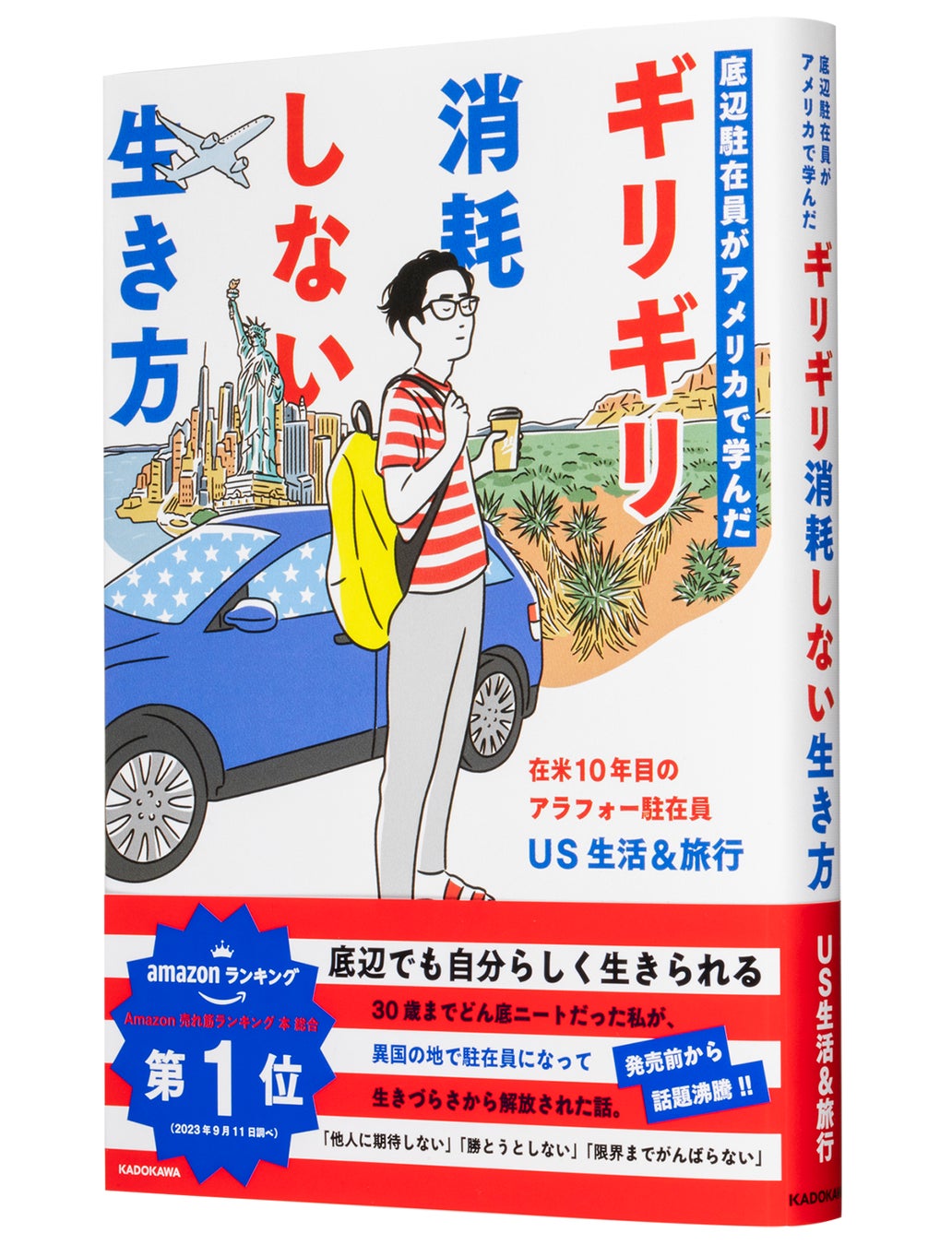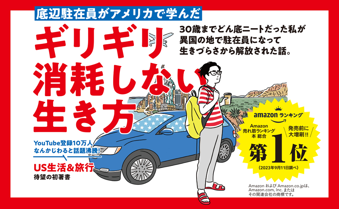 Amazon売れ筋ランキング本総合 第1位* 話題沸騰で発売前重版! なんかじわると評判の「US生活&旅行」待望の初著書『底辺駐在員がアメリカで学んだ ギリギリ消耗しない生き方』刊行