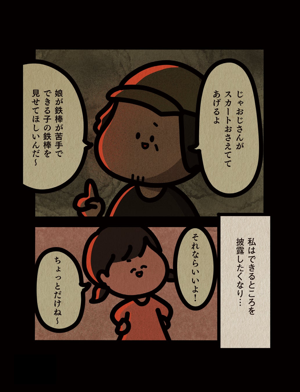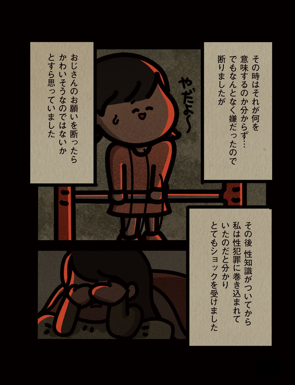 子どもは犯罪に巻き込まれてもそれが犯罪であるということを理解できていない場合もありま す。こちらの体験をした女性も、違和感を感じながらも「親に怒られるのではないか、公園で遊ぶのを禁止されたらどうしよう」と両親には相談できなかったそうです。子どもを犯罪から守るよう目を配らせることも大切ですが、保護者の目が届かない時に、自分で理解して危険を回避できるように「このパーツは人には見せてはいけない、触らせたらいけない」という教育も必要だと思えるエピソードでした。