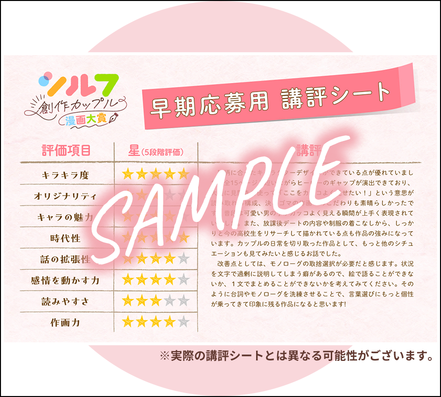 「シルフ創作カップル漫画大賞」では、新たな取り組みとして応募期間を「①早期応募期間」「②二次応募期間」の2つに分け、2024年2月29日(木)までの早期応募期間については応募から3週間(15営業日)以内に講評を送付します。
