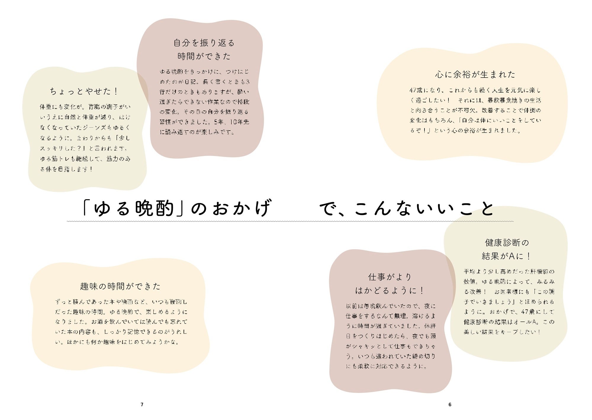 ゆる晩酌を行うことで、「痩せた」「健康診断の結果がAに!」「自分を振り返る時間ができた」「心に余裕が生まれた」「趣味の時間が生まれた」、そして何より、たまにの「とことん晩酌」がより楽しめるようになったという、いいことずくめの著者。