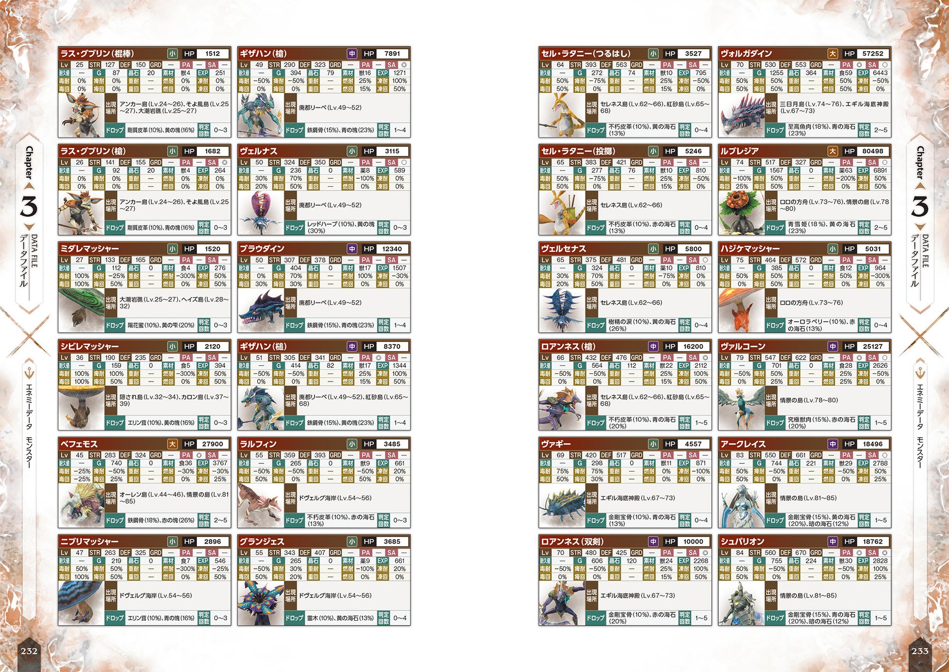 アイテムの入手方法、ショップに販売される期間、敵の耐久値やカウンターの可否など、ゲーム内では知ることができないデータまで網羅!