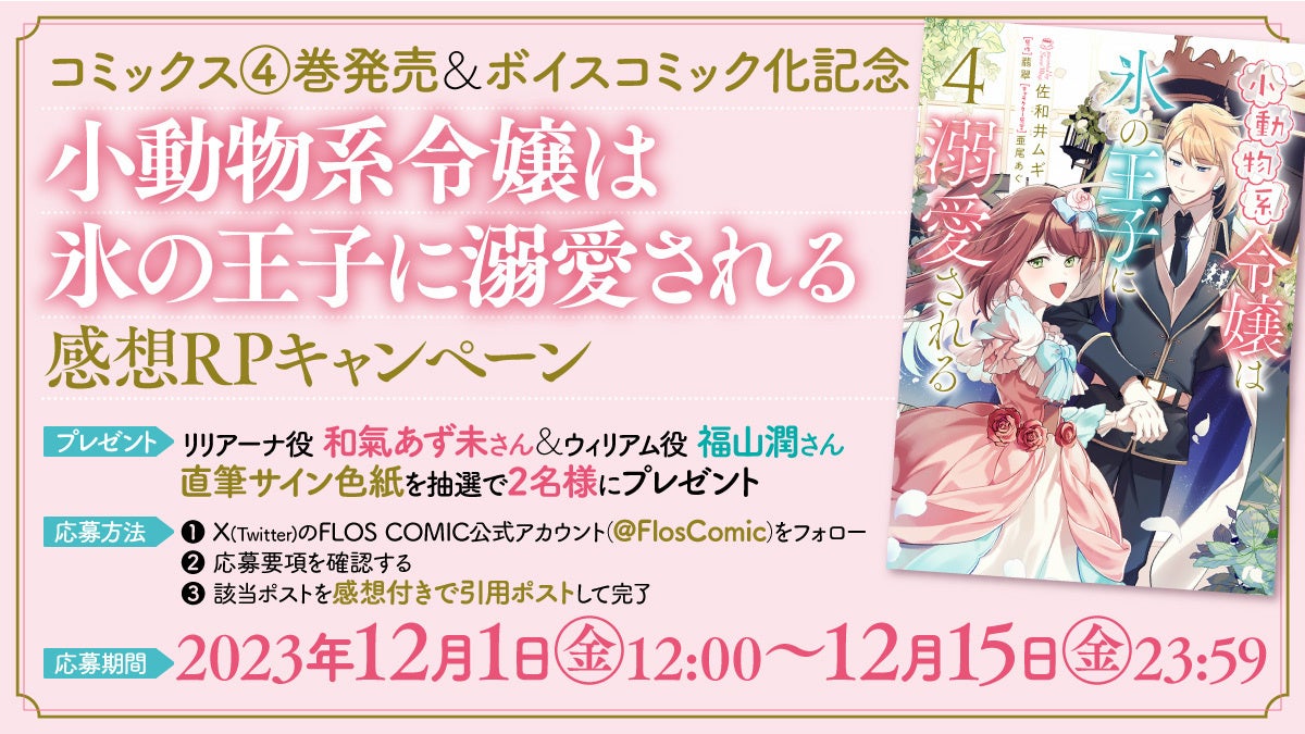 11月17日より発売の『小動物系令嬢令嬢は氷の王子に溺愛される』コミックス4巻(電子書籍含む)をご購入いただくと、購入者特典として和氣あず未&福山潤出演のボイスコミックをご視聴いただける二次元コードが帯裏についてきます(電子書籍は巻末ページ)。