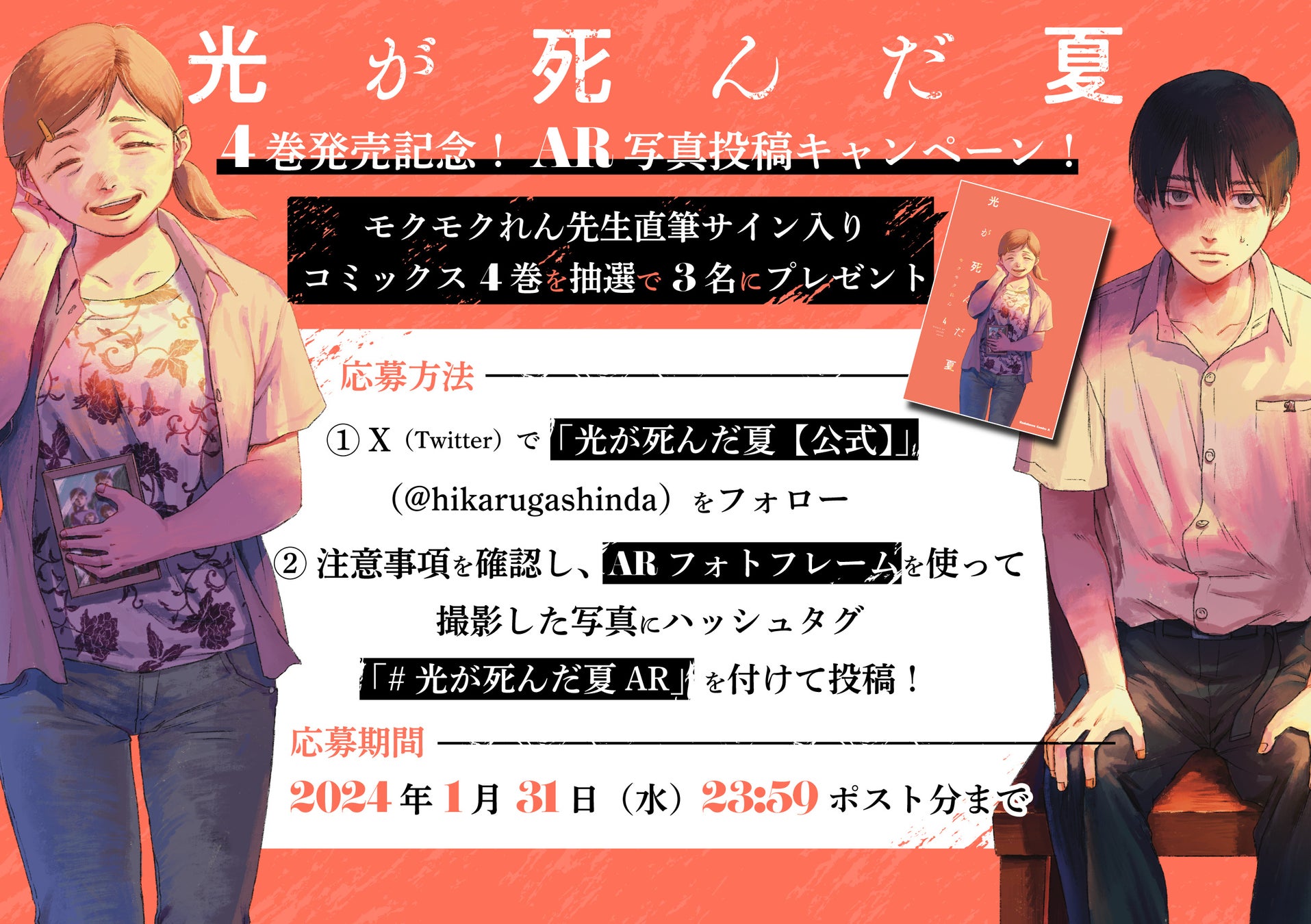 ハッシュタグ「#光が死んだ夏AR」をつけ、KADOKAWAアプリにて配信されているARフォトフレームを使用した写真をポストしていただいた方の中から、モクモクれん先生直筆サイン入りコミックス4巻を抽選で3名の方にプレゼントいたします!