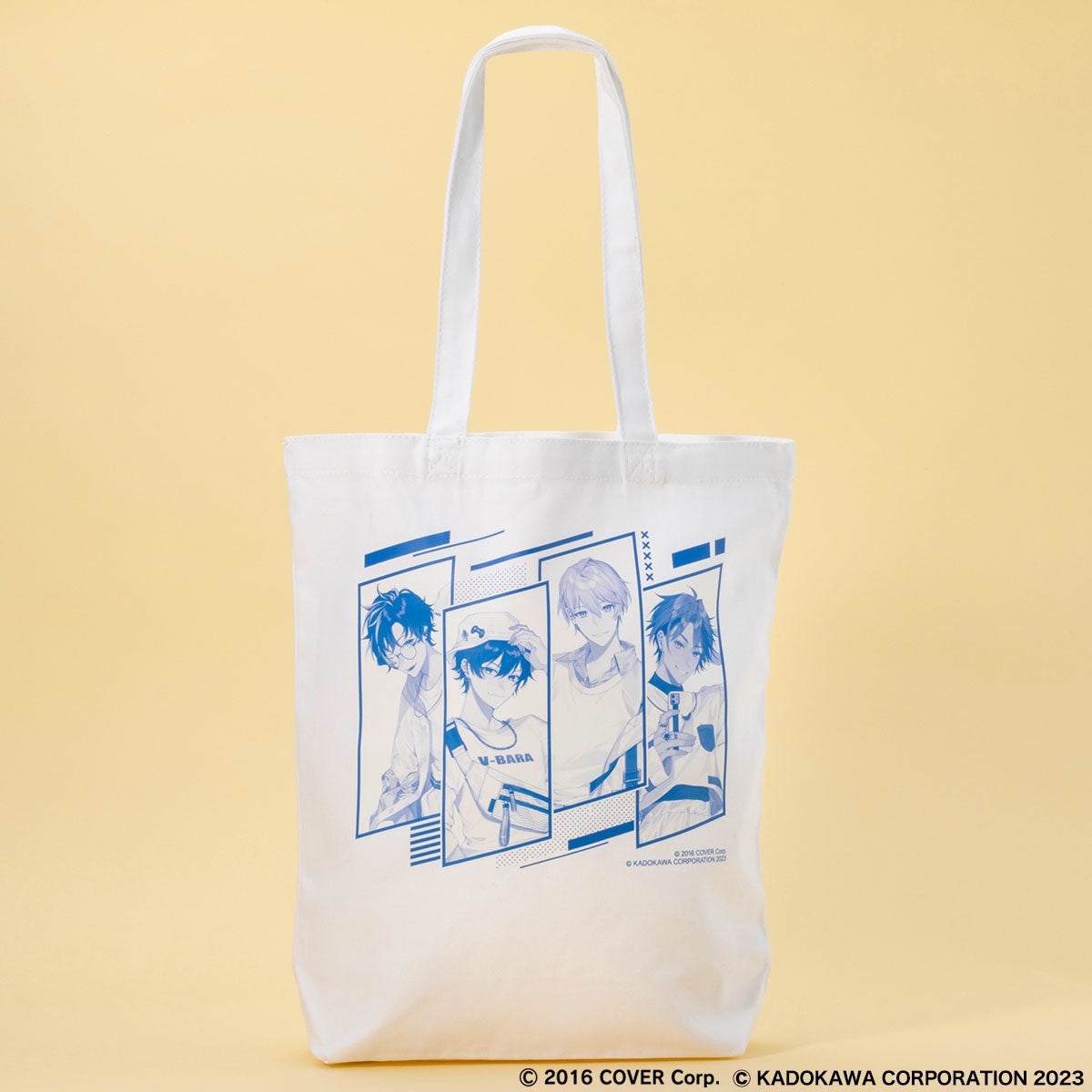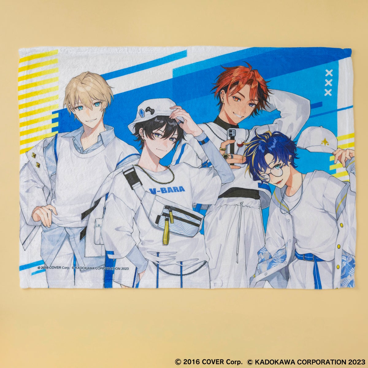 コラボグッズのモチーフとなるのは、『Vバラ!!!』のイメージカラーを配したオリジナルコスチュームを身にまとった深町寿成、アステル・レダ、岸堂天真、夕刻ロベルの4名で、いずれも完全描き下ろしのイラストとなっております。