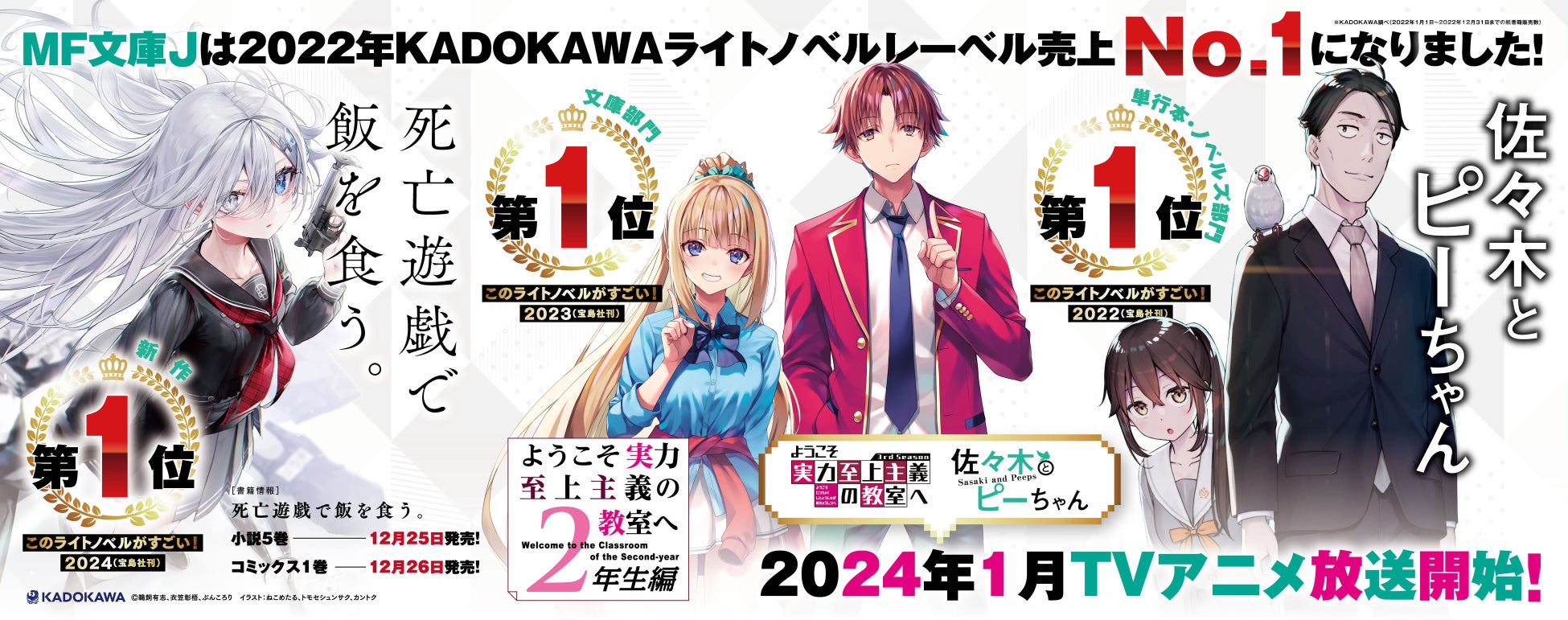 『ようこそ実力至上主義の教室へ』『佐々木とピーちゃん』は2024年の1月よりTVアニメ新シリーズの放送が予定されておりますので、こちらもご期待ください。
