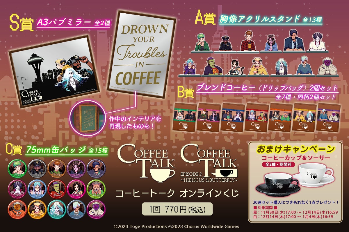 『コーヒートーク』のオンラインくじがくじ引き堂に登場! 「コーヒー」にスポットを当てた本作ならではの特製グッズの数々を手に入れて、あなただけの最高のコーヒータイムを彩ろう!