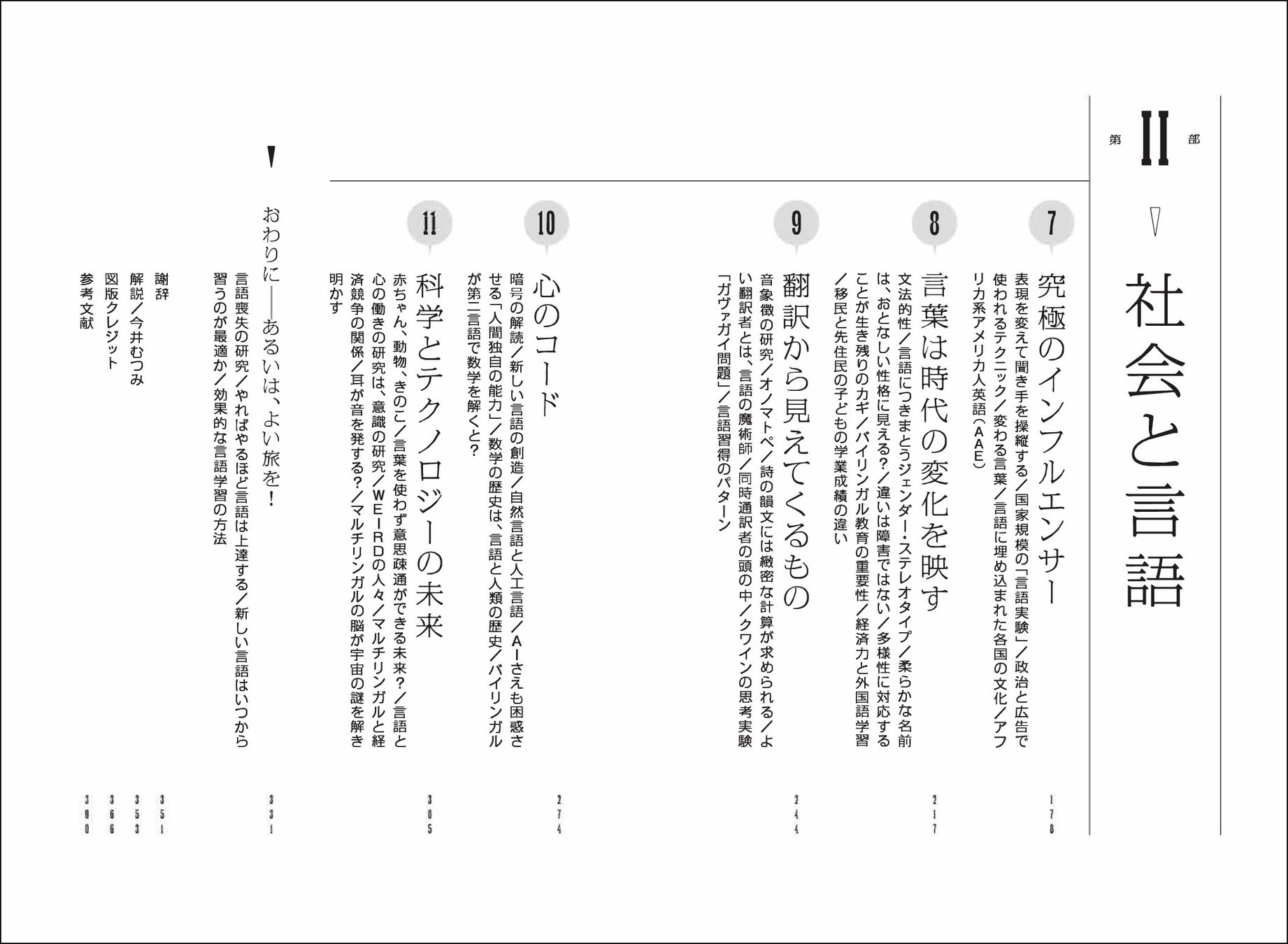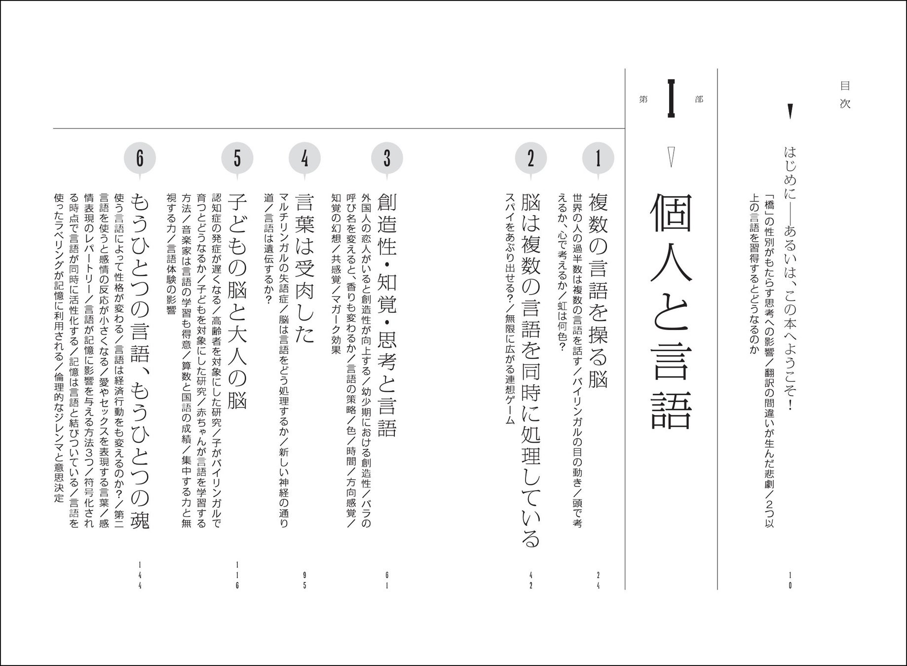 新しい言語を獲得するたびに、情報をどう受け取り、どう解釈するかということが影響を受けます。何を覚えているか、自分自身と周りの世界をどうとらえるかということ、さらには感情、洞察、意思決定、行動も、話す言語から影響を受けます。情報を整理、処理、構築するときも、言語は欠かせないツールであり、だからこそ大きな進歩を起こす力にもなります。『言語の力』は、数多くの科学的な研究を検証し、新しい言語を学ぶことの利点を紹介しています。